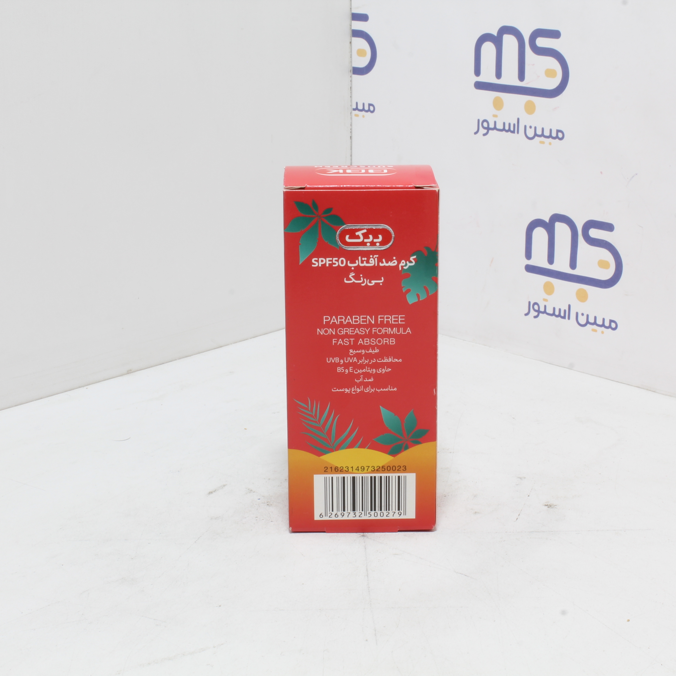 کرم ضد آفتاب SPF50بی رنگ برای انواع پوست ببک 50 میلی لیتری