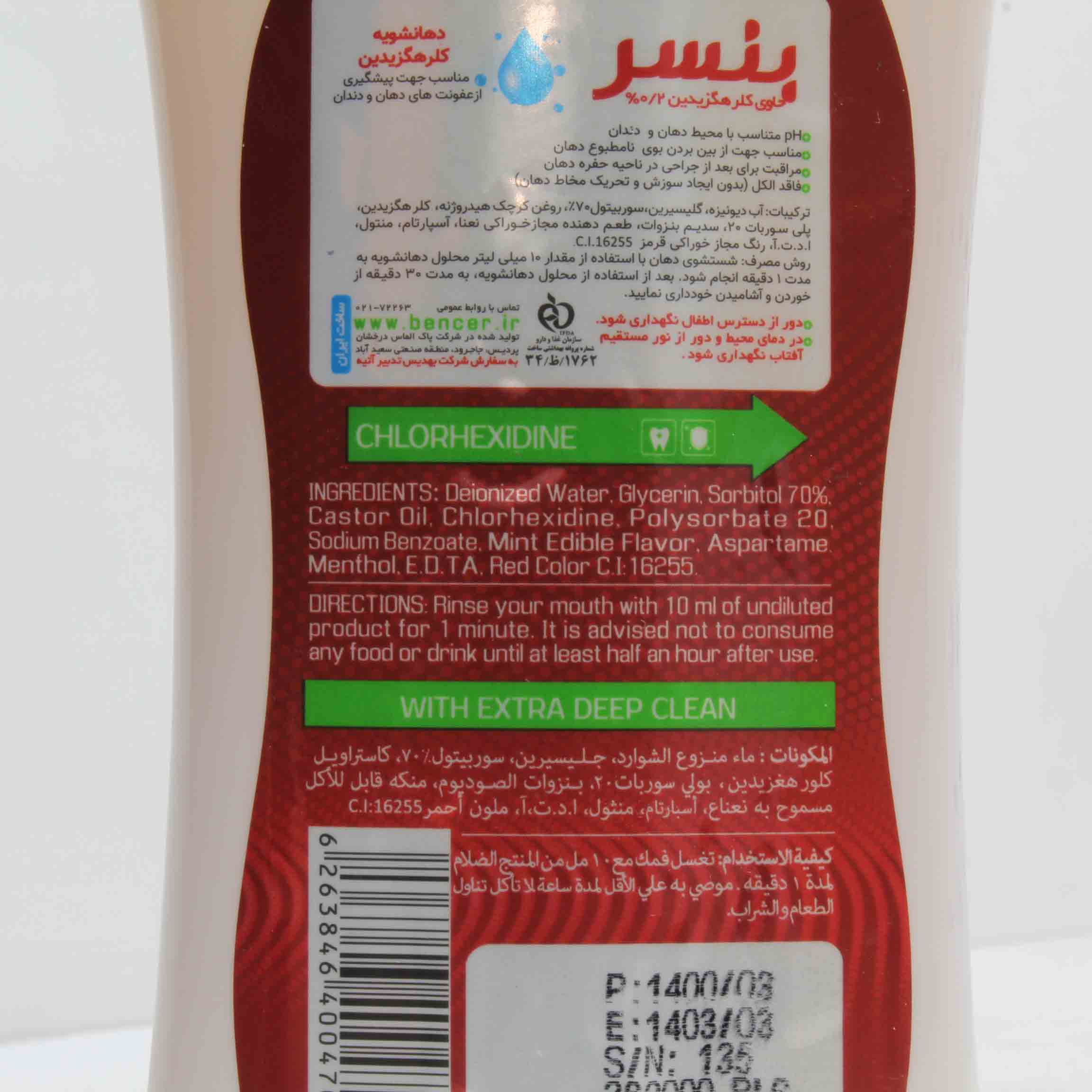 قیمت خرید و مشخصات دهان شویه حاوی کلروهگزیدین جهت پیشگیری از عفونتهای دهان و دندان بنسر |دهان شویه حاوی کلروهگزیدین جهت پیشگیری از عفونتهای دهان و دندان بنسر 400 میلی لیتر