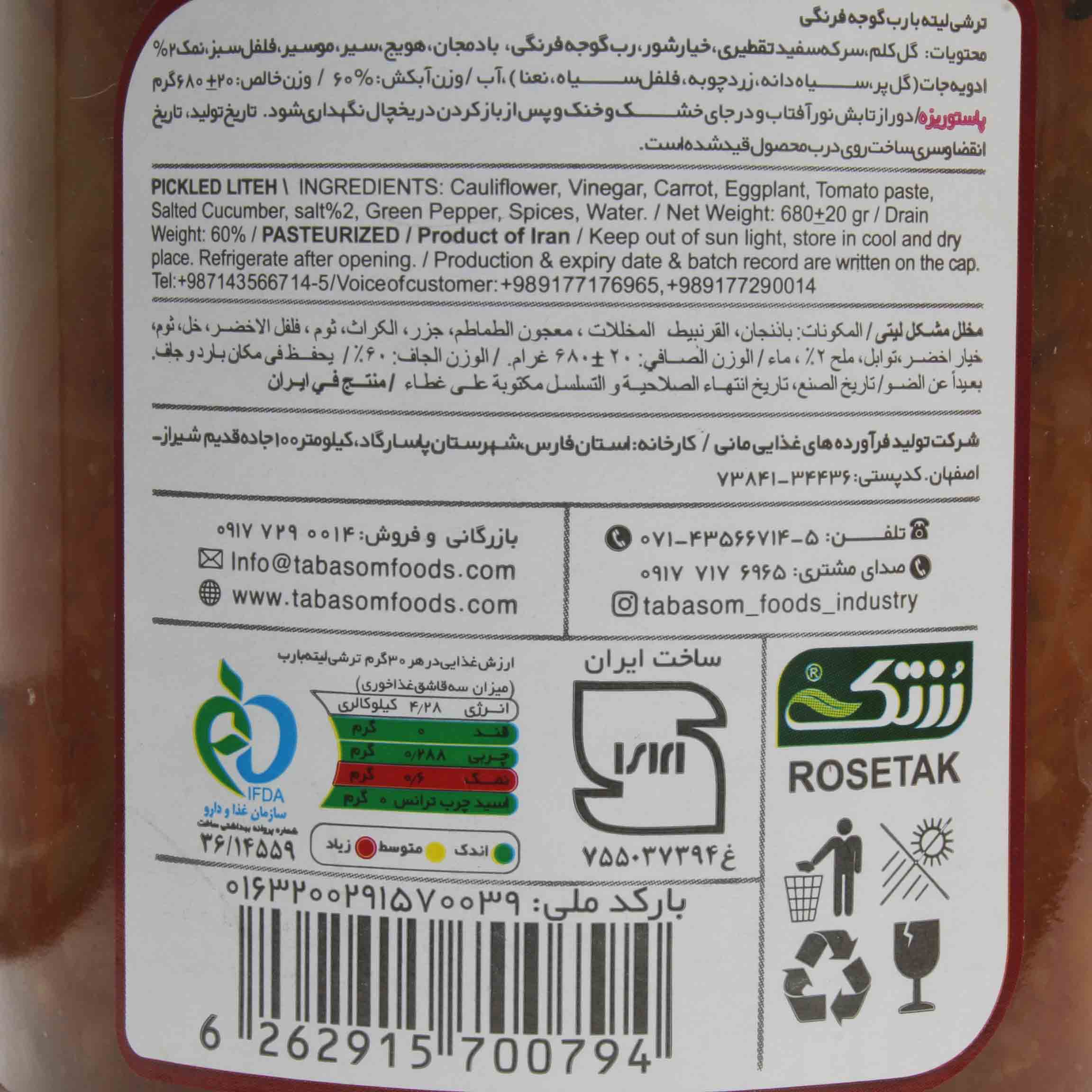 هایپر مارکت ترشیجات و شوریجات ترشیجات ترشی لیته بندری با رب گوجه فرنگی رز تک 680 گرمی