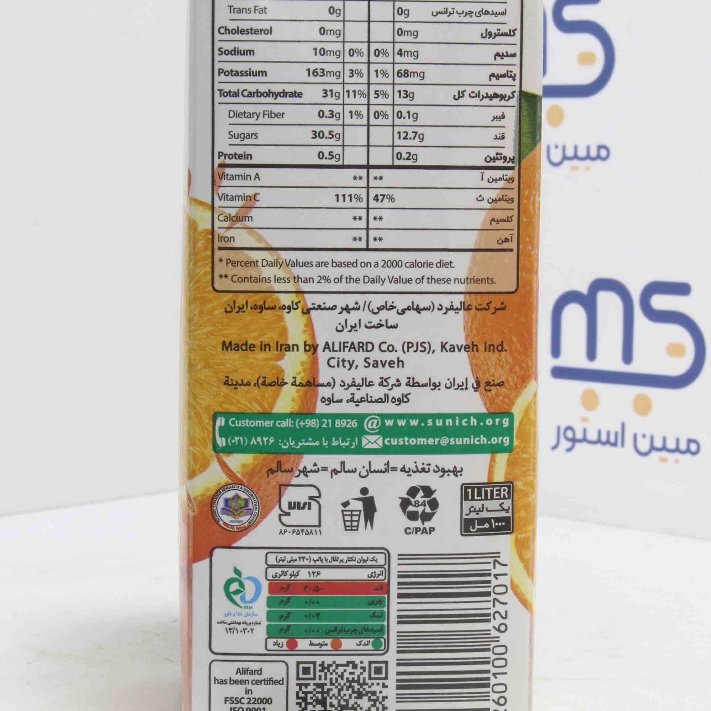 شکر ـ کنسانتره طبیعی آب پرتقال ـ پالپ پرتقال 5% ـ اسید سیتریک ـ اسید اسکوربیک ـ آب.