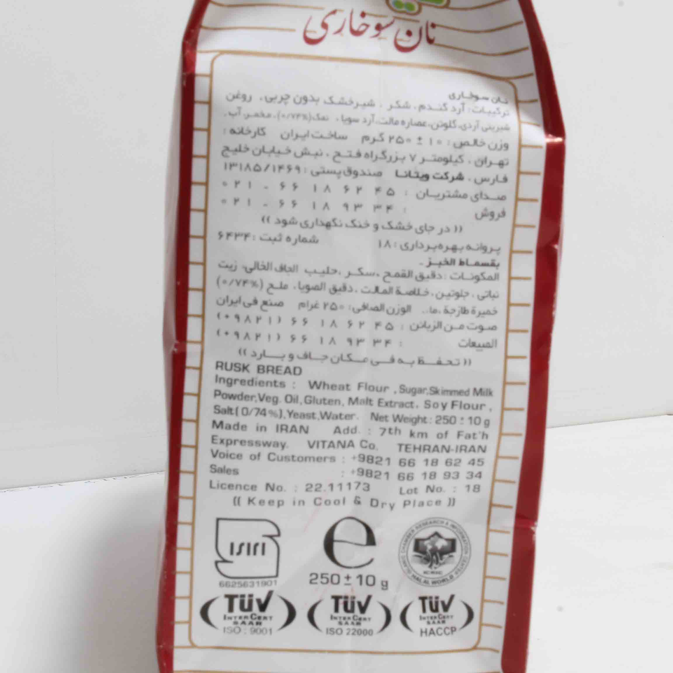 پاکت محتوی سوخاری ویتانا از یک لایه پلی پروپیلن و دو لایه کاغذ مخصوص صد در صد بهداشتی با کیفیت بالا تهیه شده که مانع از نفوذ رطوبت و عوامل خارجی می گردد.