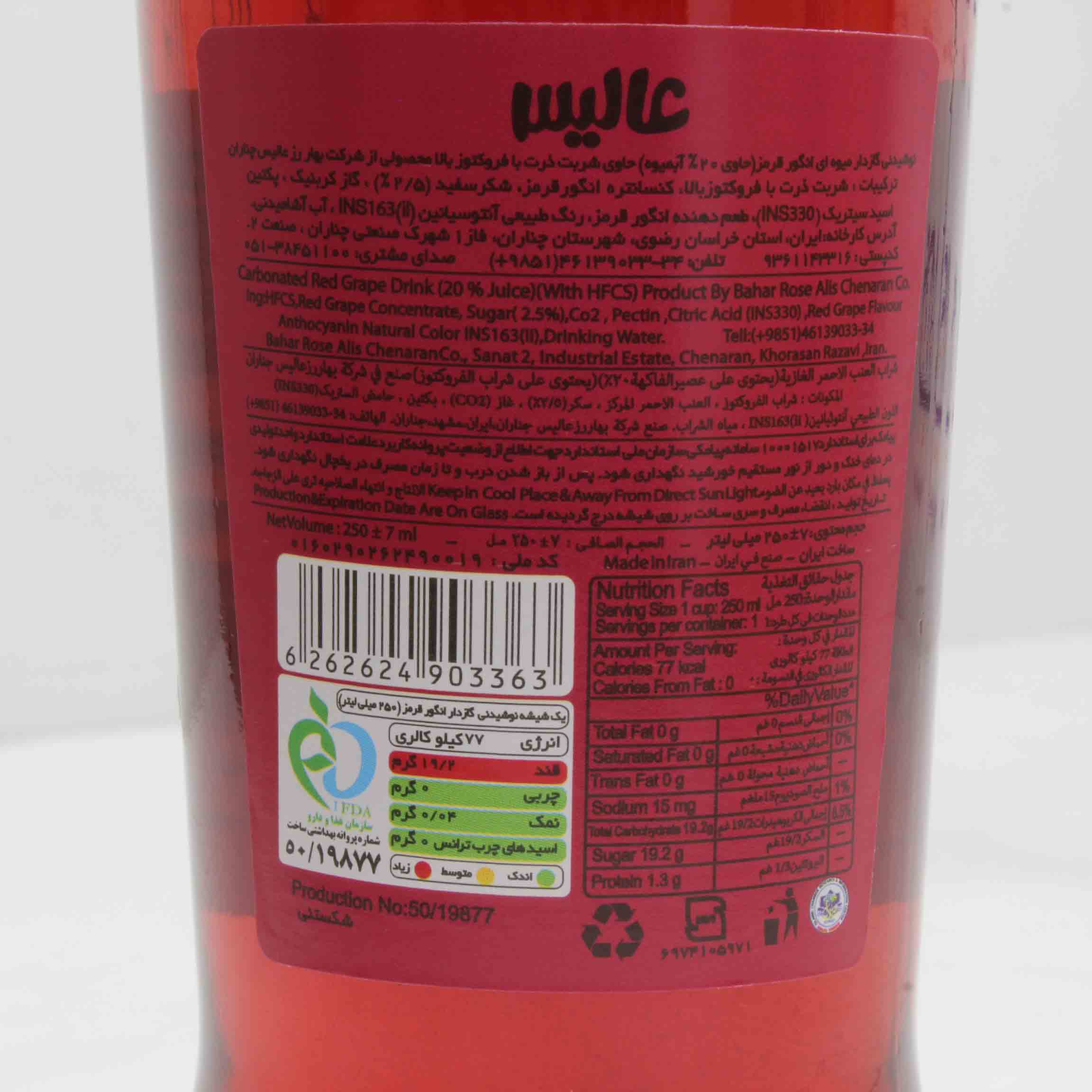 نوشیدنی میوه ای گازدار انگور قرمز عالیس 250 میلی لیتری