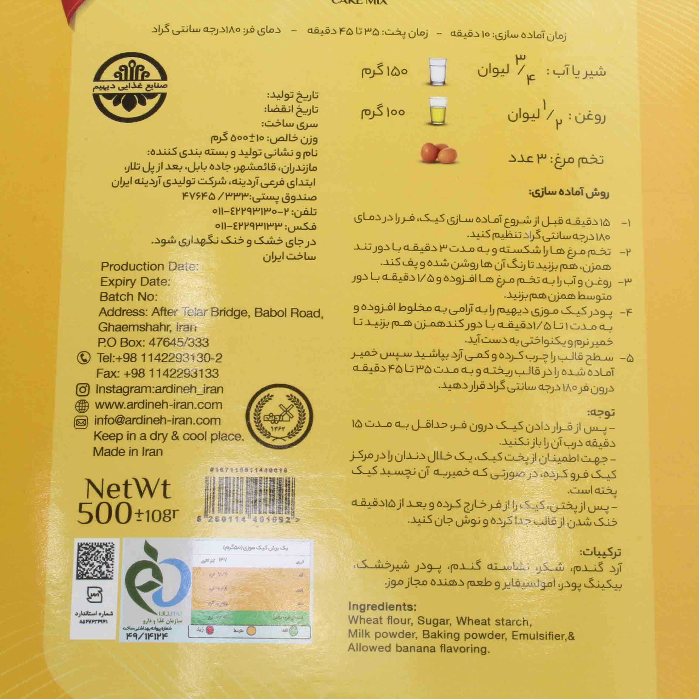 آرد گندم ، شکر ، نشاسته گندم ،پودر شیر خشک ، بیکینگ پودر ، امولسیفایر ، طعم دهنده مجاز موز.