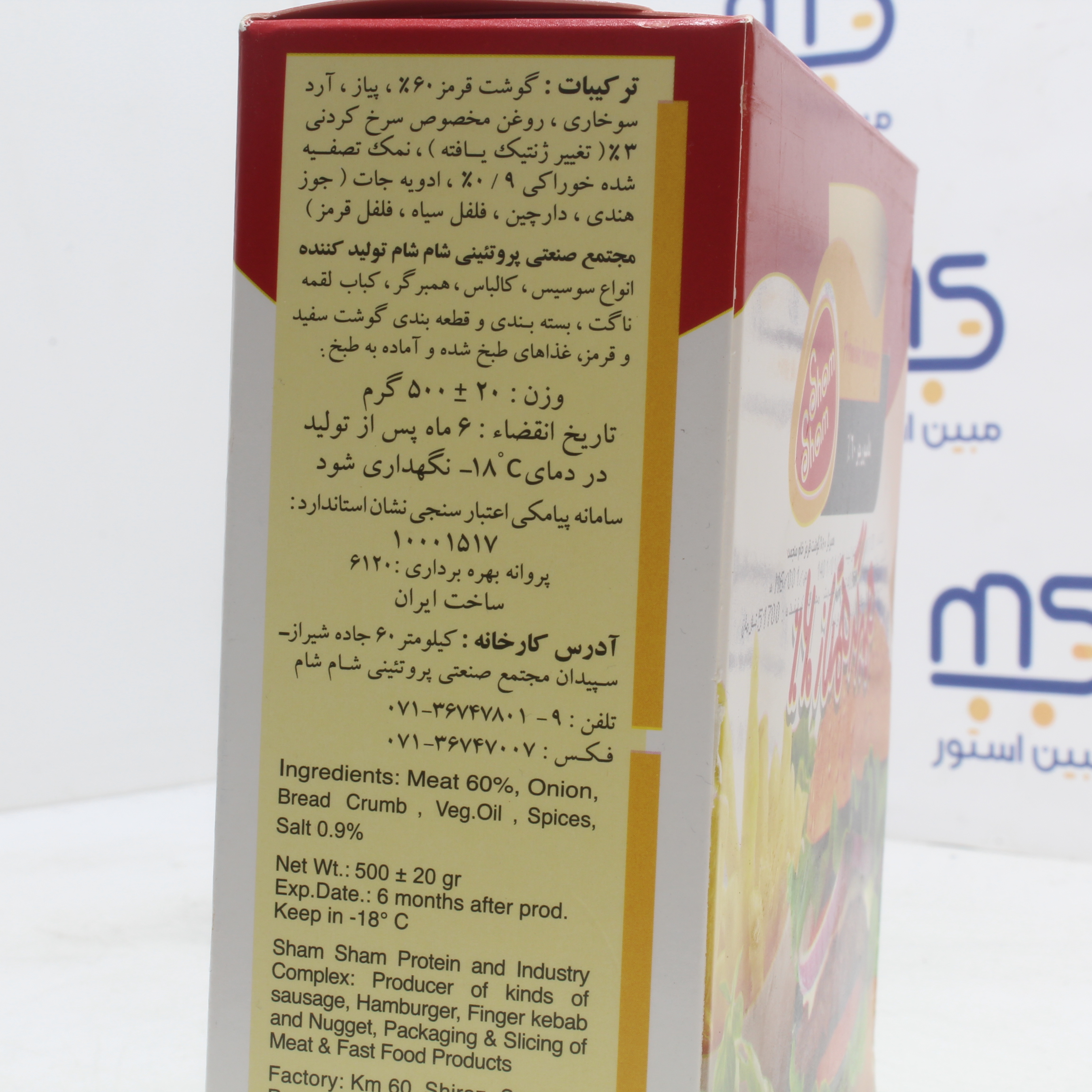 گوشت قرمز 60% ، پیاز ، آرد سوخاری ، روغن مخصوص سرخ کردنی 3% ( تغییر ژنتیک یافته ) ، نمک تصفیه شده خوراکی 0.9% ، ادویه جات ( جوز هندی ، دارچین ، فلفل سیاه ، فلفل قرمز )