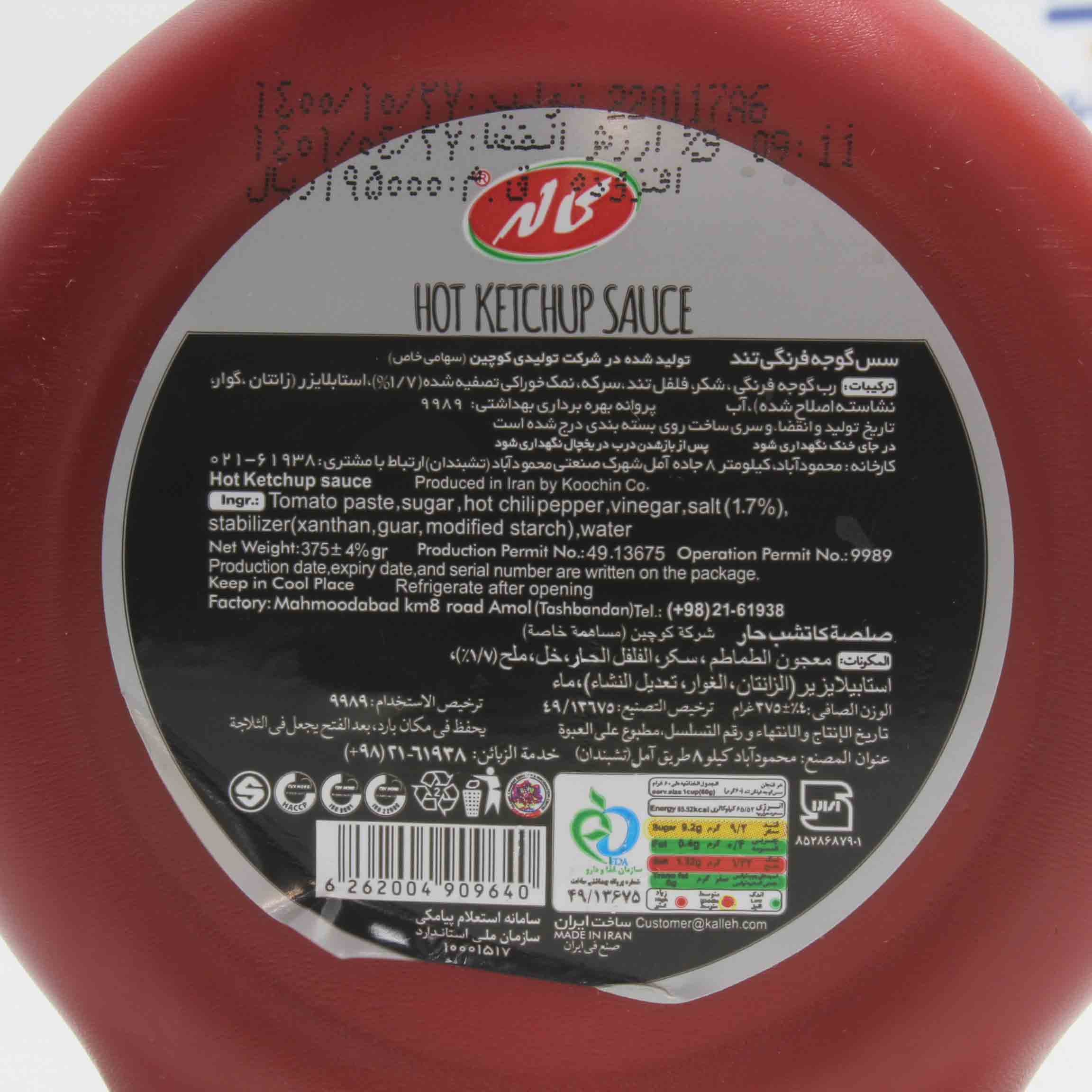 رب گوجه فرنگی ، شکر ، فلفل تند ، سرکه ، نمک (1.7%) ، استابلایزر ( زانتان ، گوار ، نشاسته اصلاح شده ) ، آب.