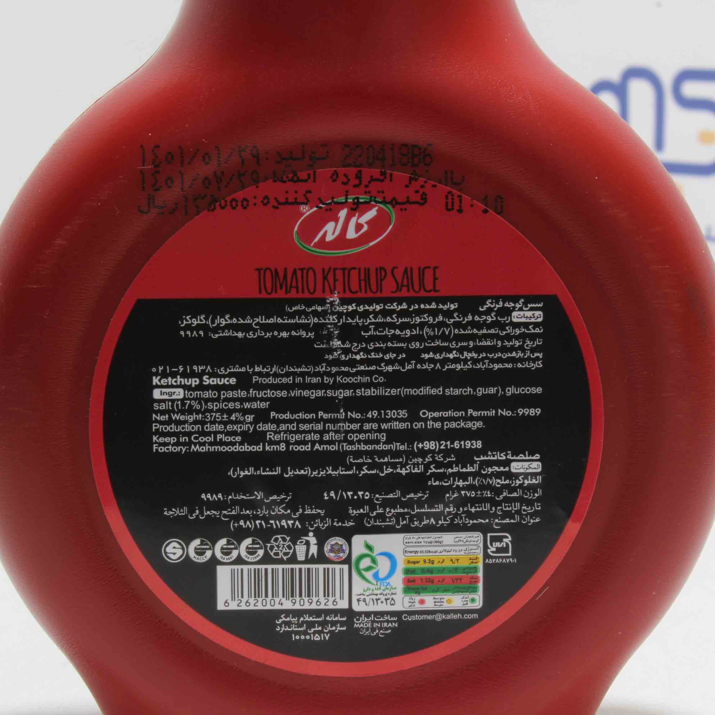 رب گوجه فرنگی ، فروکتوز ، سرکه ، شکر ، پایدار کننده ( نشاسته اصلاح شده گوار ) ، گلوکز ، نمک خوراکی تصفیه شده (1.7%) ، ادویه جات ، آب.