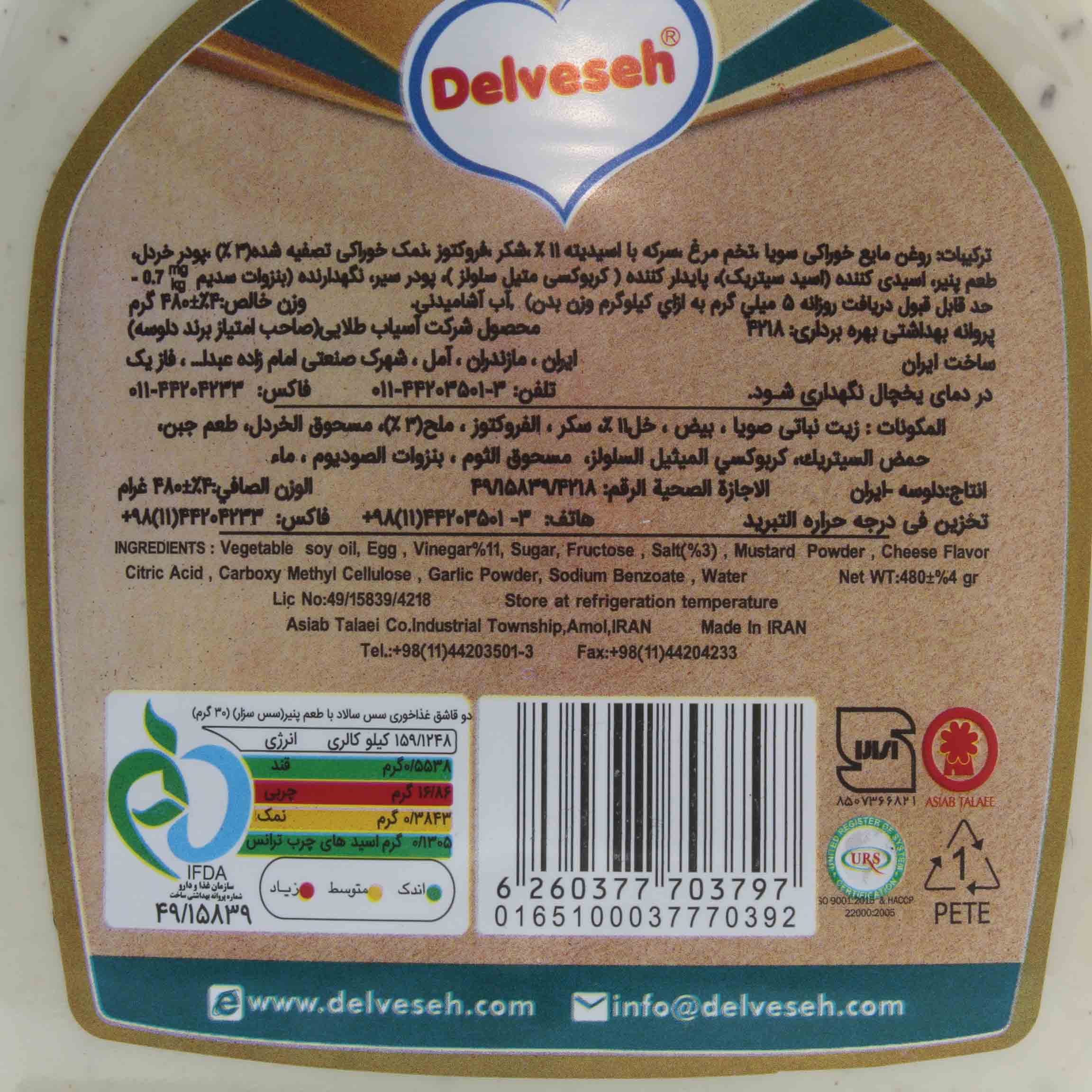 روغن مایع خوراکی سویا، تخم مرغ ، سرکه با اسیدیته 11 % ، شکر ، فروکتوز ، نمک خوراکی تصفیه شده (3% ) ، پودر خردل ، طعم پنیر ، اسیدی کننده ( اسید سیتریک ) ، پایدار کننده ( کربوکسی متیل سلولز ) ، پودر سیر ، نگهدارنده ( بنزوات سدیم ) ، آب آشامیدنی
