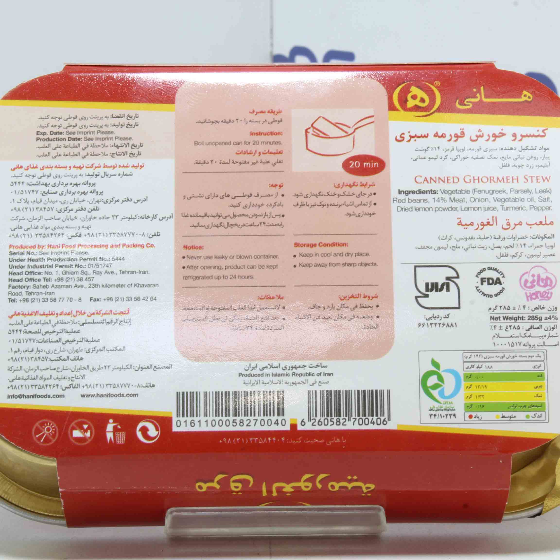 سبزی قورمه ، لوبیا قرمز ، 14% گوشت ، پیاز ، روغن نباتی مایع ، نمک تصفیه خوراکی ، گرد لیمو عمانی ، آبلیمو ، زرد چوبه ، فلفل