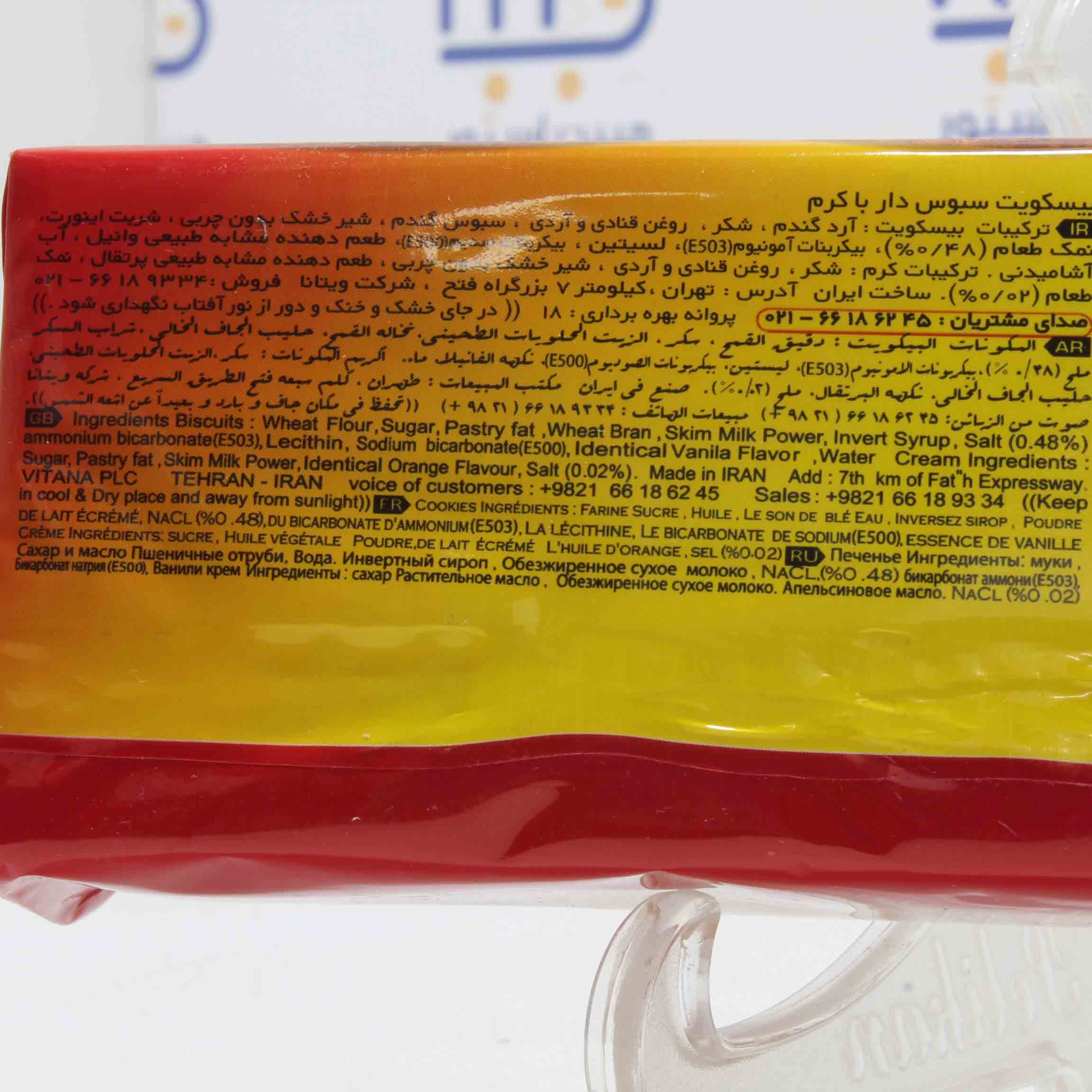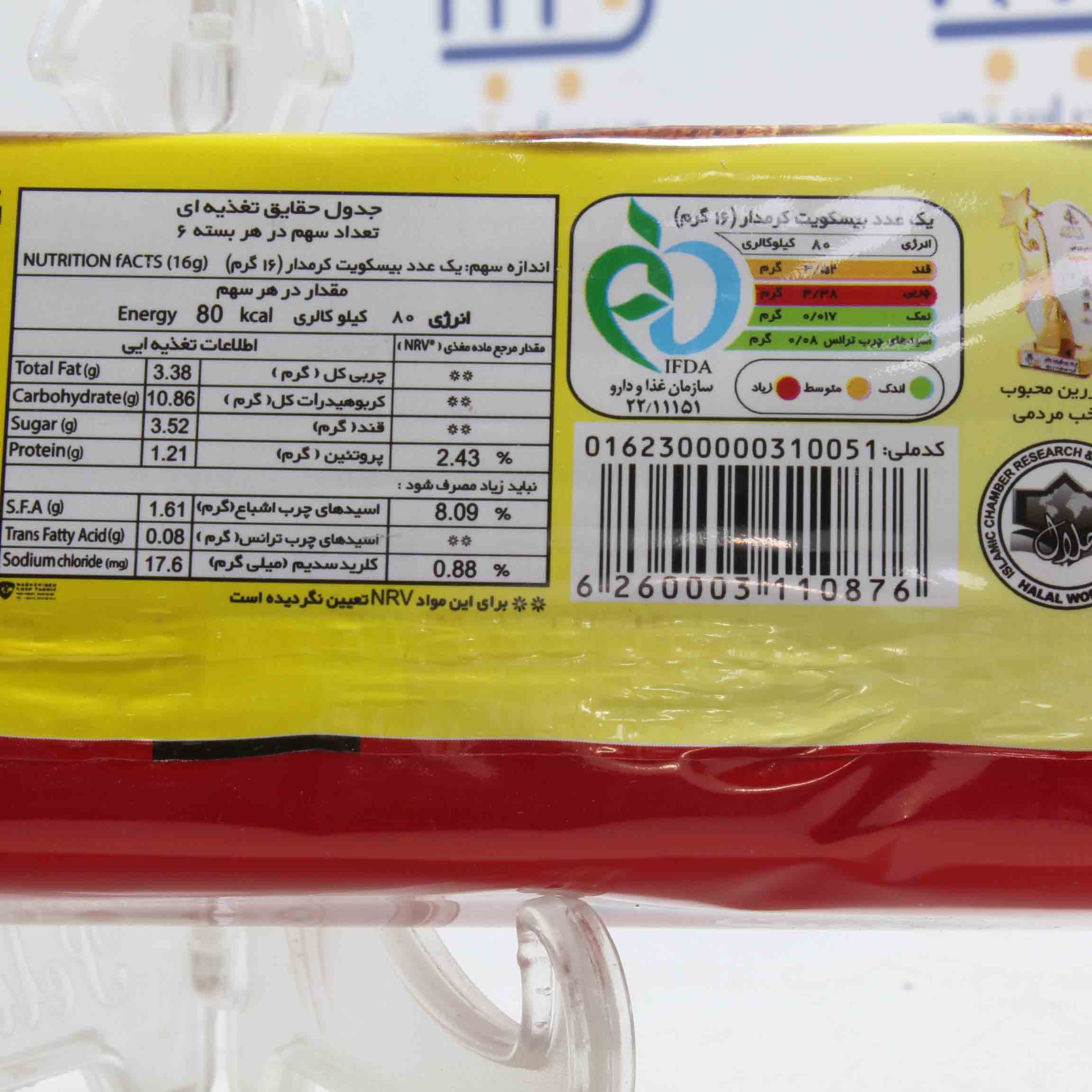 آرد گندم ـ روغن قنادی و آردی ـ شکر ـ شکر قهوه ای ـ سبوس گندم(فرآوری شده) ـ عصاره مالت ـ بی کربنات سدیم(E500) ـ بی کربنات آمونیوم(E503) ـ شربت اینورت ـ شربت فروکتوز ـ شیر خشک بدون چربی ـ نمک تصفیه شده خوراکی(3/0%) ـ لستین سویا(E322) ـ طعم دهنده مشابه وانیل ـ طعم دهنده مشابه طبیعی کارامل ـ آب.