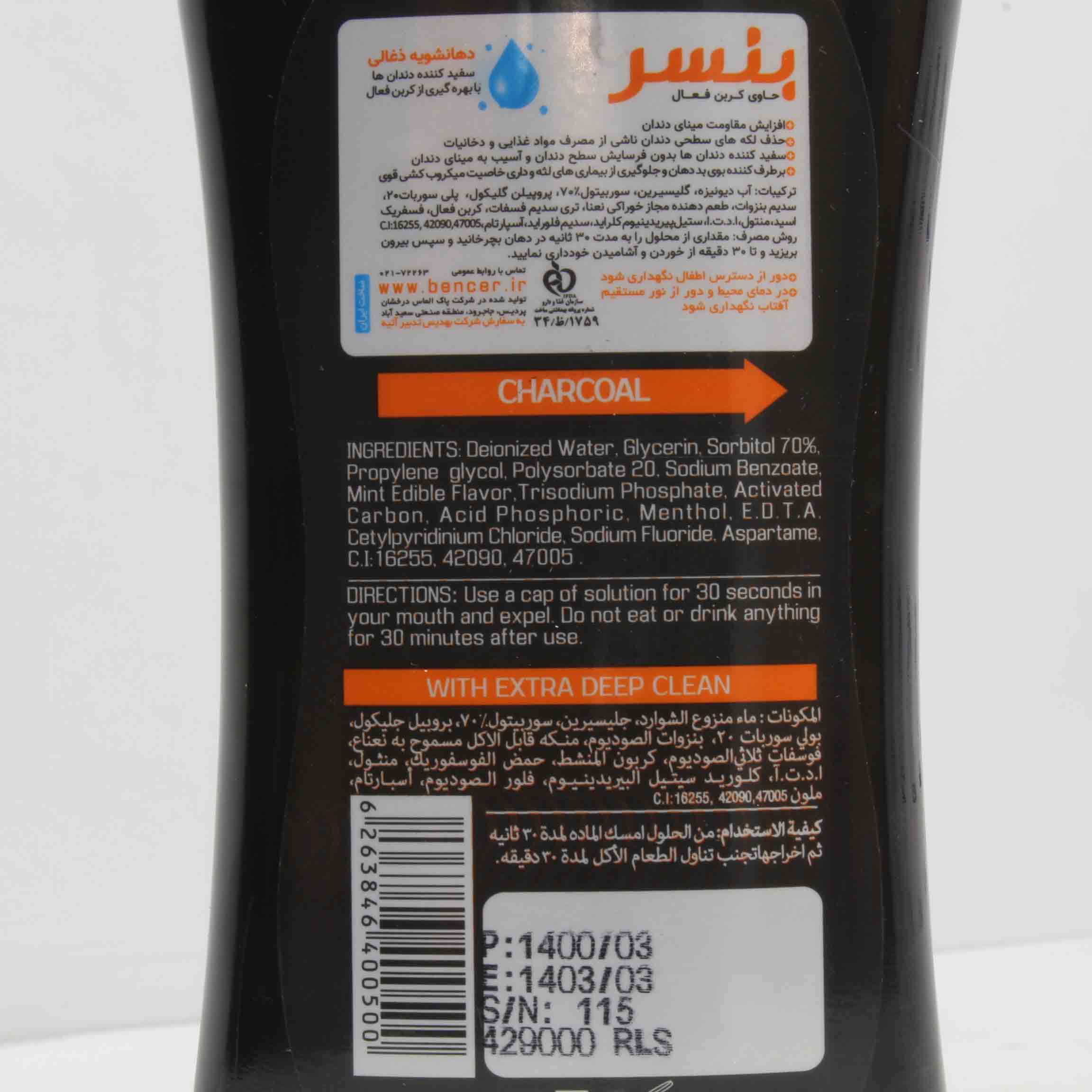 آب دیونیزه ، گلیسیرین ، سوربیتول 70% ، پروپیلن گلیکول ، پلی سوربات 20 ، سدیم بنزوات ، طعم دهنده مجاز خوراکی نعنا ، تری سدیم فسفات ، کربن فعال ، فسفریک اسید ، منتول ، ا.د.ت ، ستیل پرییدینیوم کلراید ، سدیم فلوراید ، آسپارتام