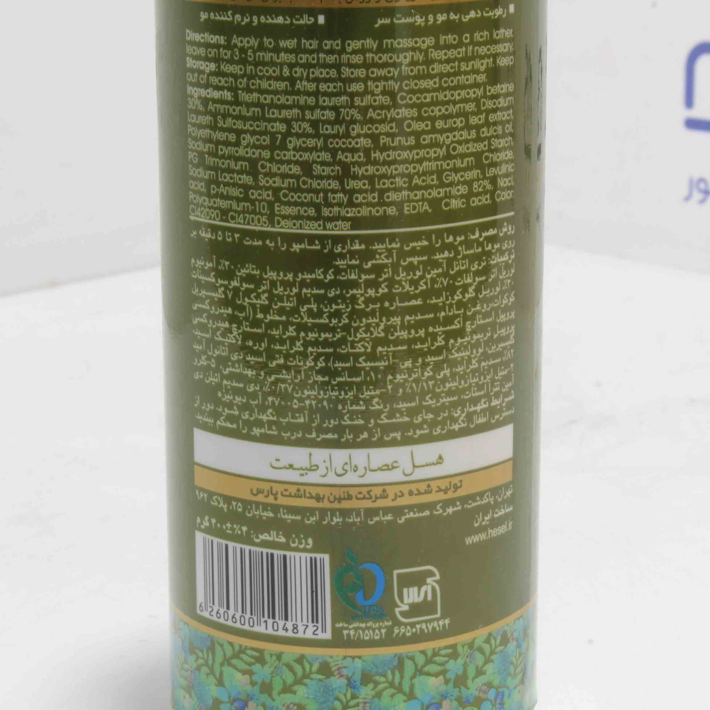 قیمت خرید و مشخصات شامپو موی سر حاوی عصاره برگ زیتون و روغن بادام مناسب برای موهای خشک هسل |شامپو موی سر حاوی عصاره برگ زیتون و روغن بادام مناسب برای موهای خشک هسل 400 گرمی