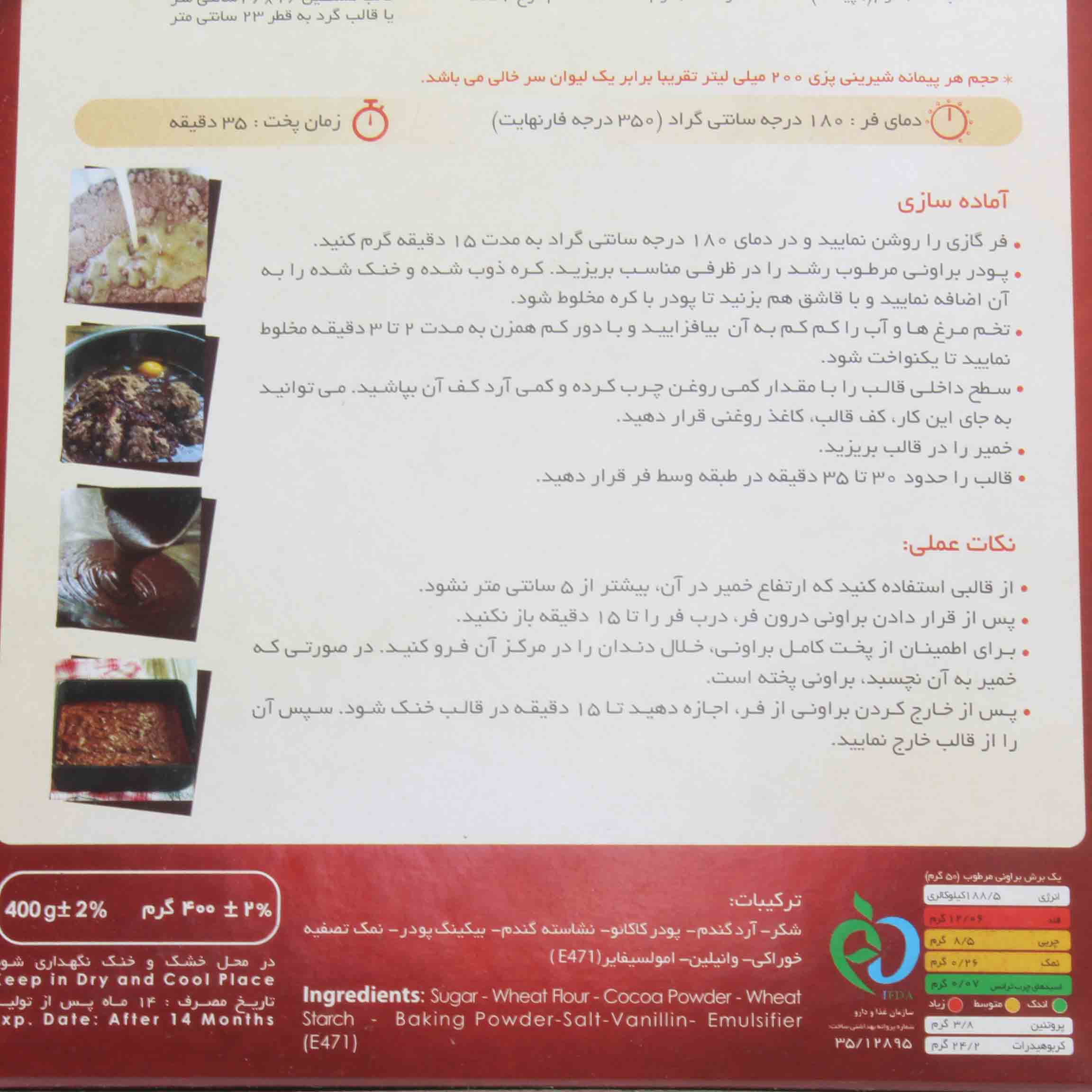 آرد گندم ، شکر ، نشاسته گندم ، بیکینگ پودر ، امولسیفایر 471E ، نمک تصفیه خوراکی ، وانیلین ، پودر کاکائو .