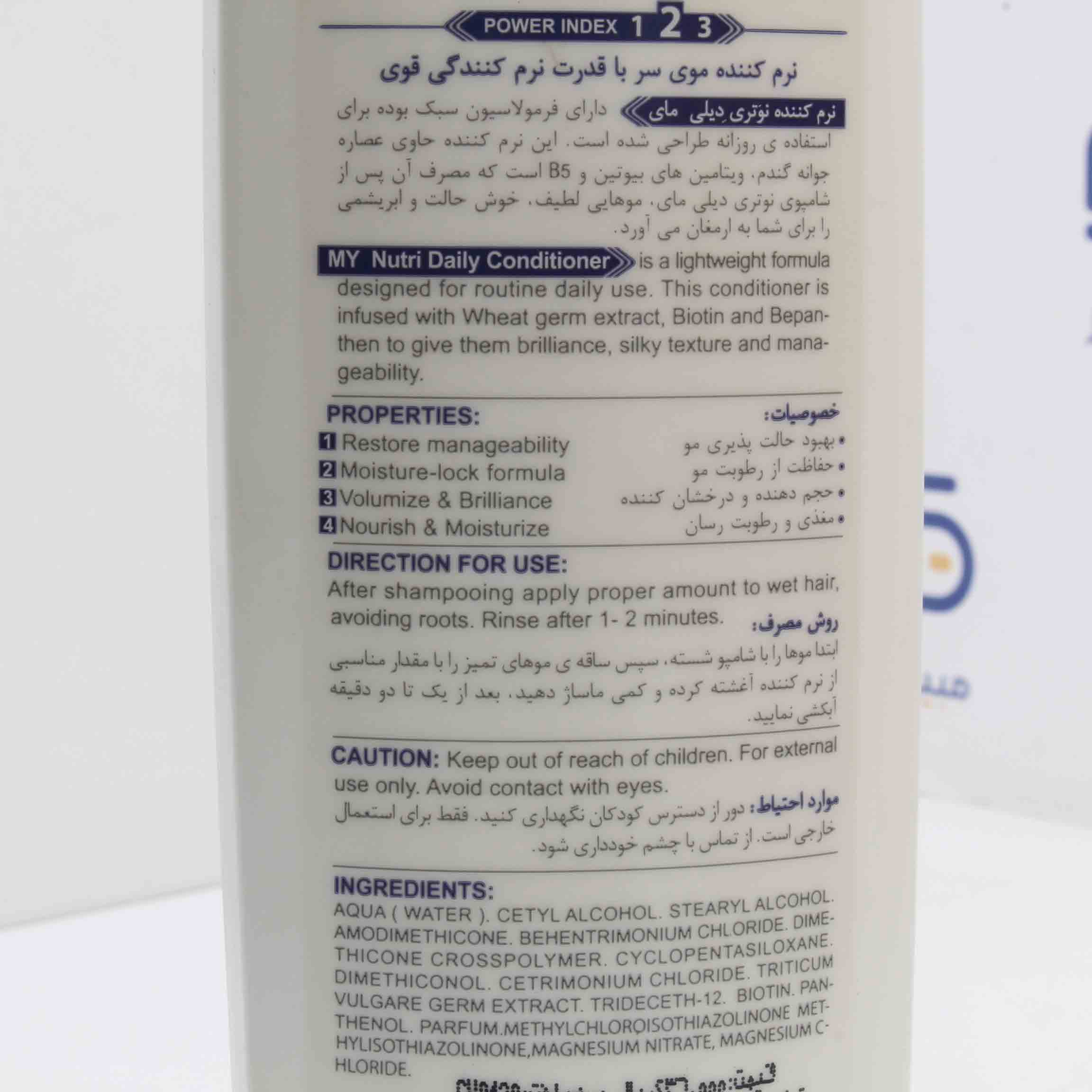 دارای فرمولاسیون سبک بوده برای استفاده ی روزانه طراحی شده است. این نرم کننده حاوی عصاره جوانه گندم ، ویتامین های بیوتین و B5 است که مصرف آن پس از شامپوی نوتری دیلی مای ، موهایی لطیف ، خوش حالت و ابریشمی را برای شما به ارمغان می آورد.