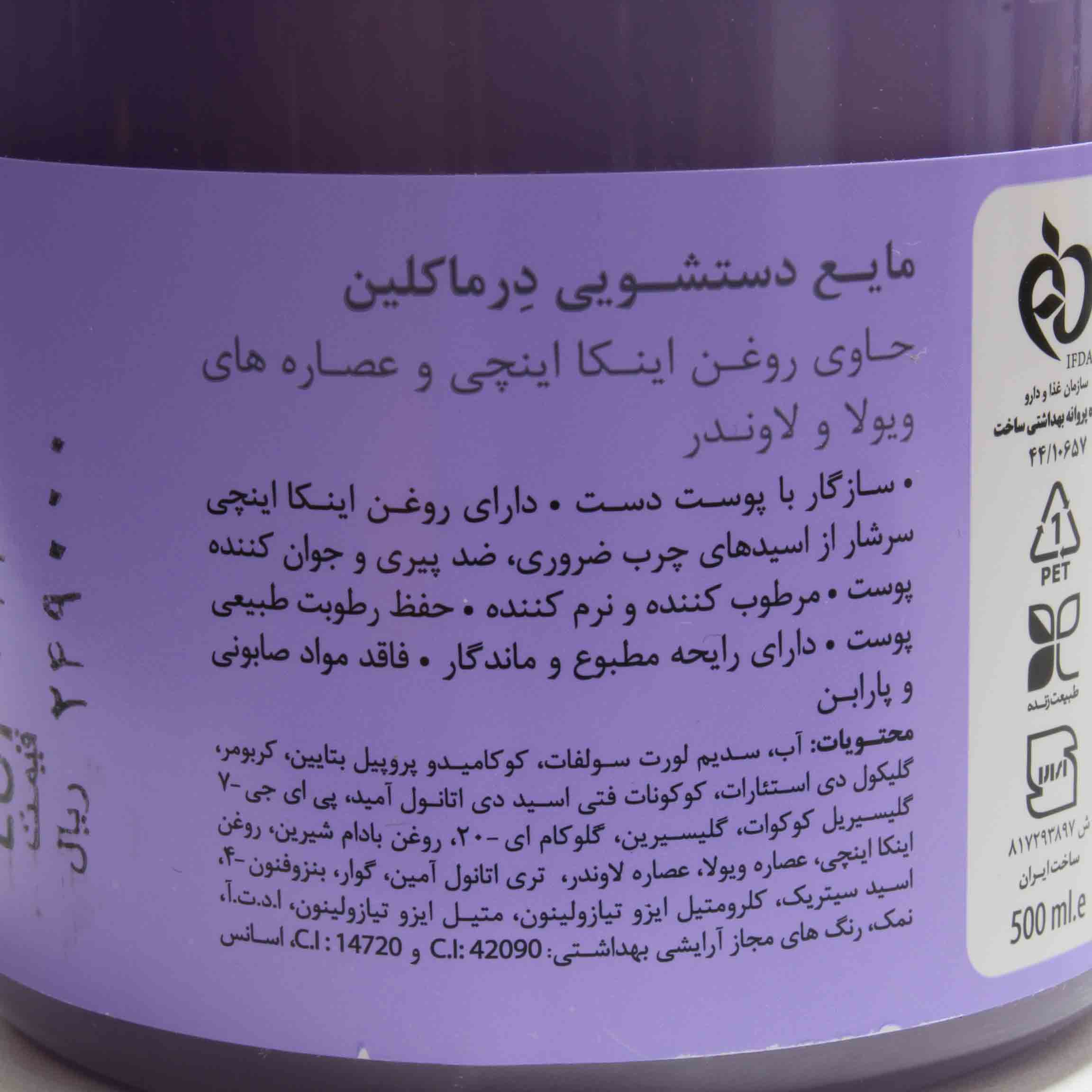 قیمت خرید و مشخصات مایع دستشویی حاوی روغن اینکا اینچی و عصاره های ویولا و لاوندر درماکلین|مایع دستشویی حاوی روغن اینکا اینچی و عصاره های ویولا و لاوندر درماکلین 500 میلی لیتری