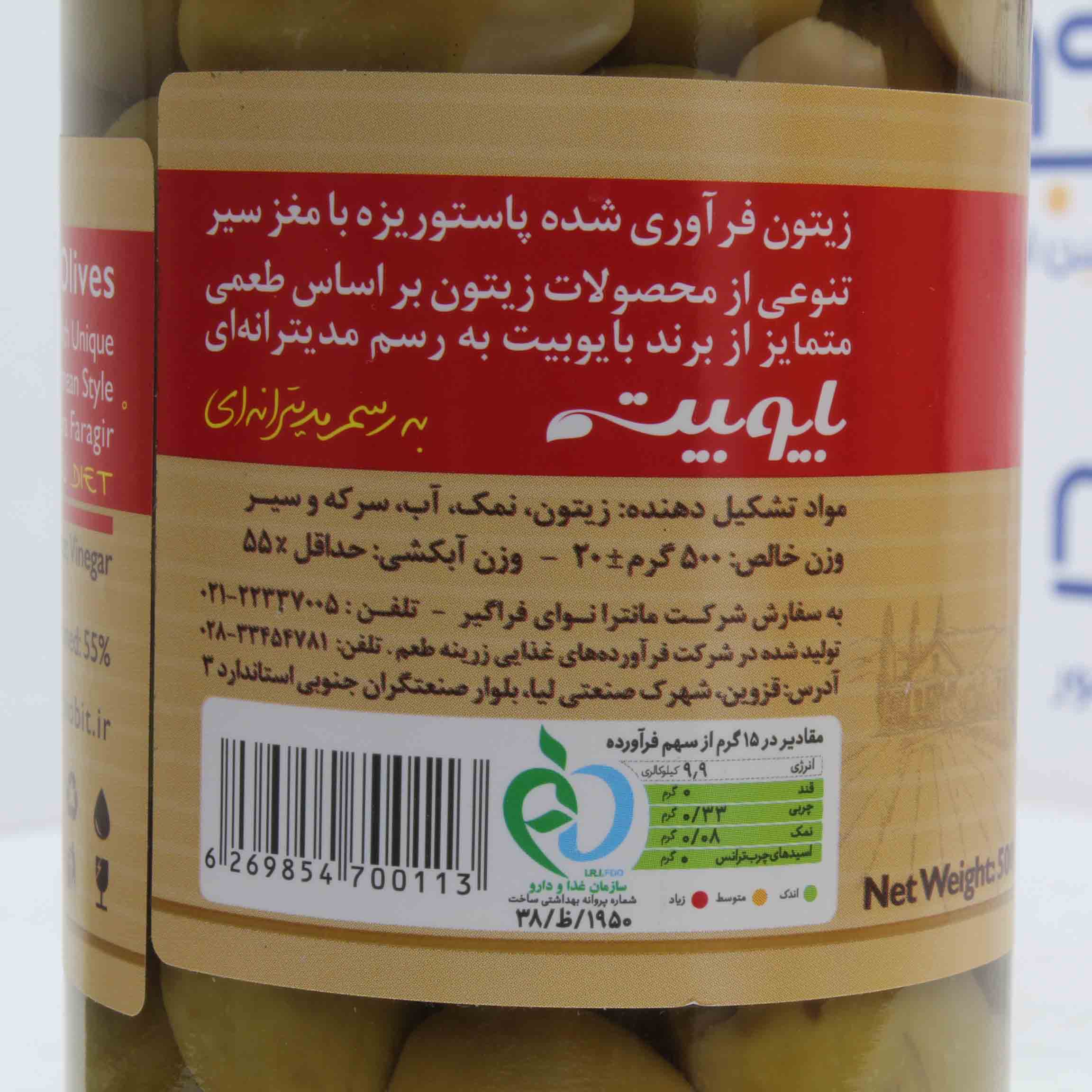 قیمت خرید و مشخصات زیتون فرآوری شده با مغز سیر بایوبیت |زیتون فرآوری شده با مغز سیر بایوبیت 500 گرمی