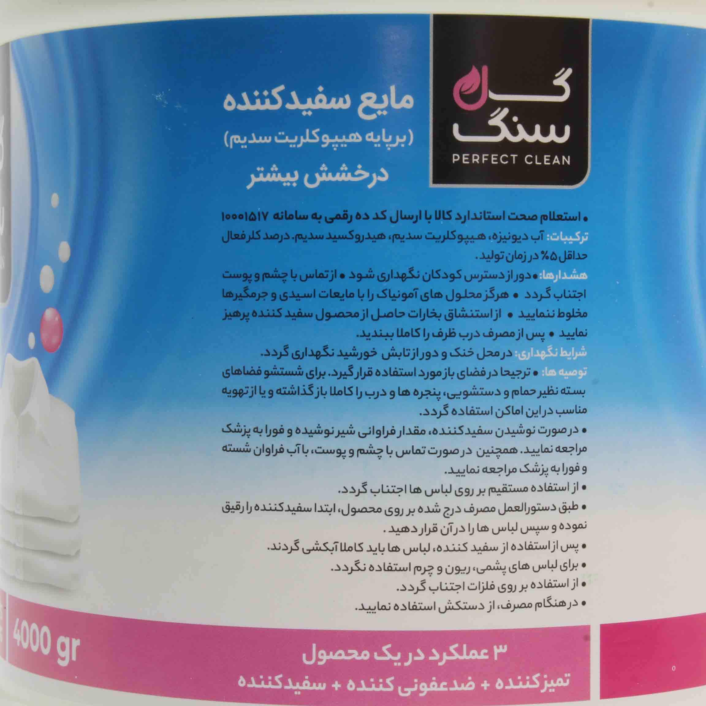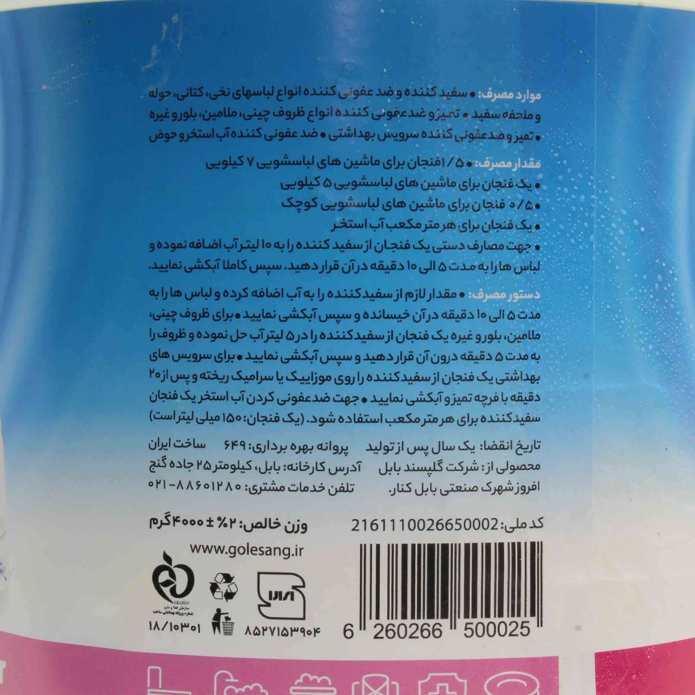 سفید کننده و ضدّ عفونی کنندۀ انواع لباسهای نخی، کتانی، حوله و ملحفۀ سفید