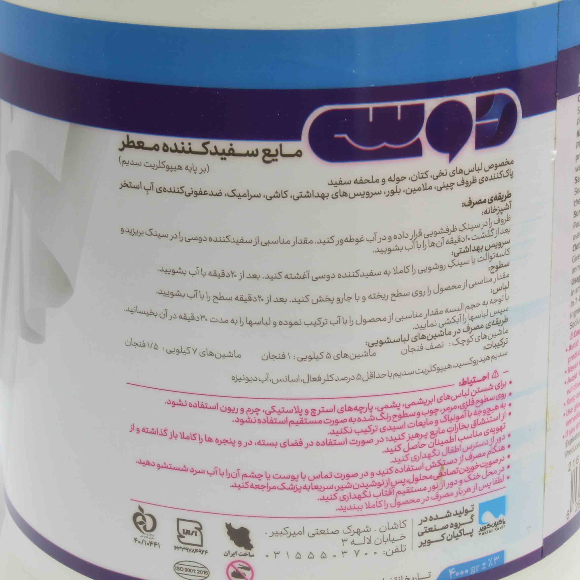 یک فنجان مایع سفید کنندۀ دوسی را با 10 لیتر آب مخلوط کرده و لباسها یا ظروف را مدّت 15 دقیقه در آن قرار داده و سپس آبکشی نمایید.