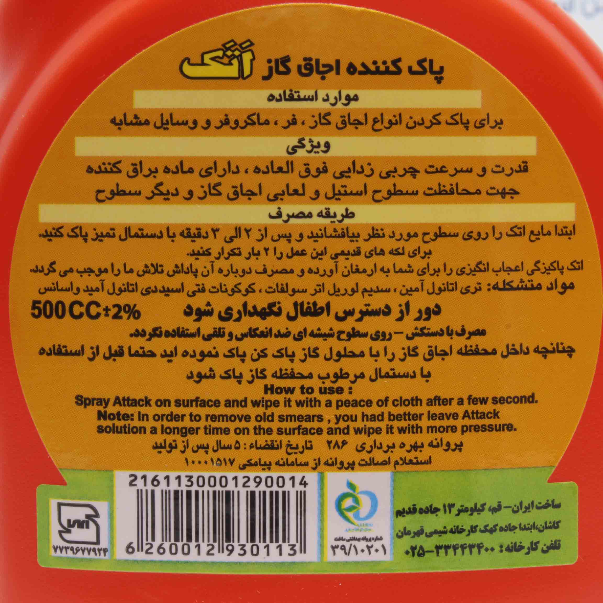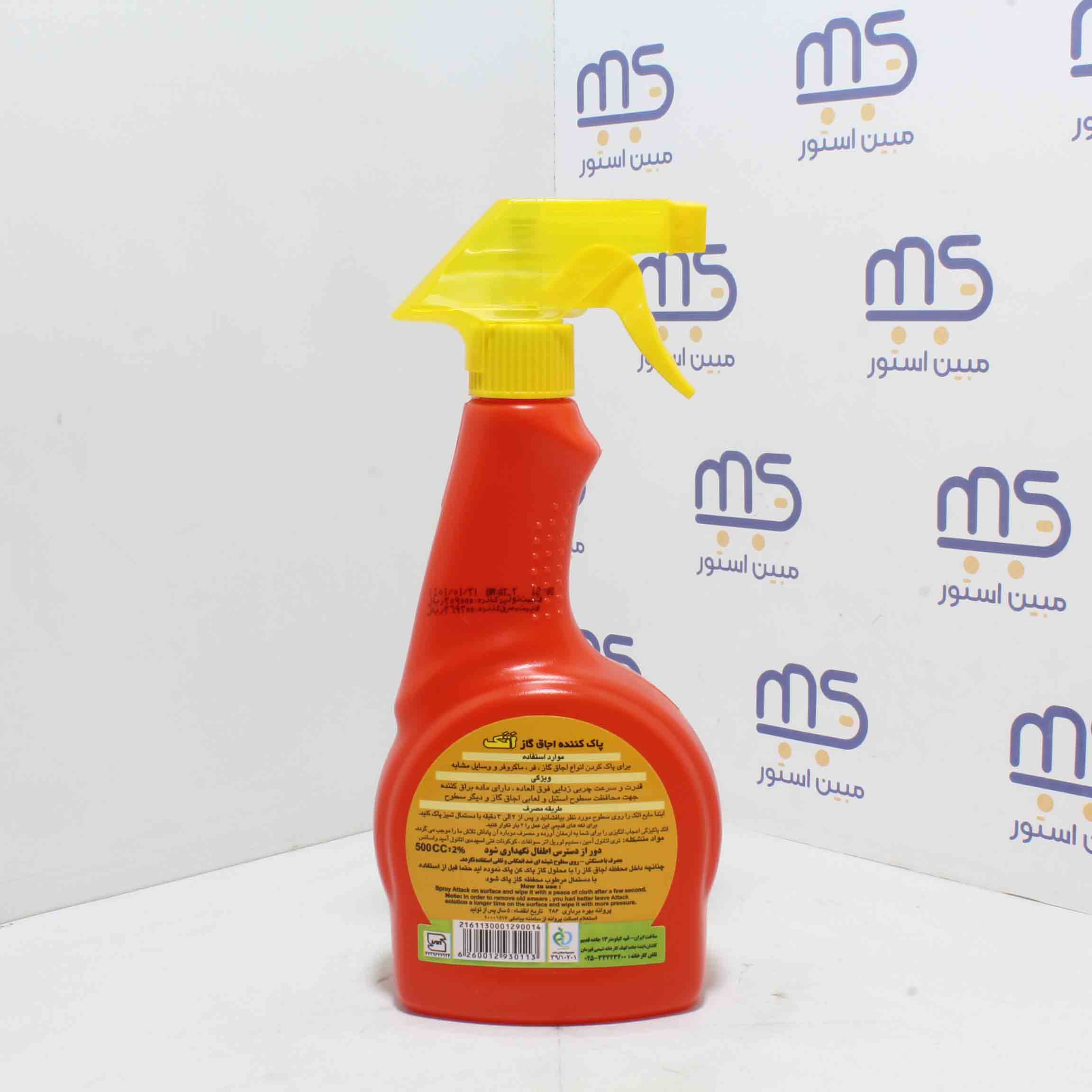 ابتدا مایع اتک را روی سطوح مورد نظر بیافشانید و پس از 2 الی 3 دقیقه با دستمال تمیز پاک کنید. برای لکّههای قدیمی، این عمل را 2 بار تکرار کنید.