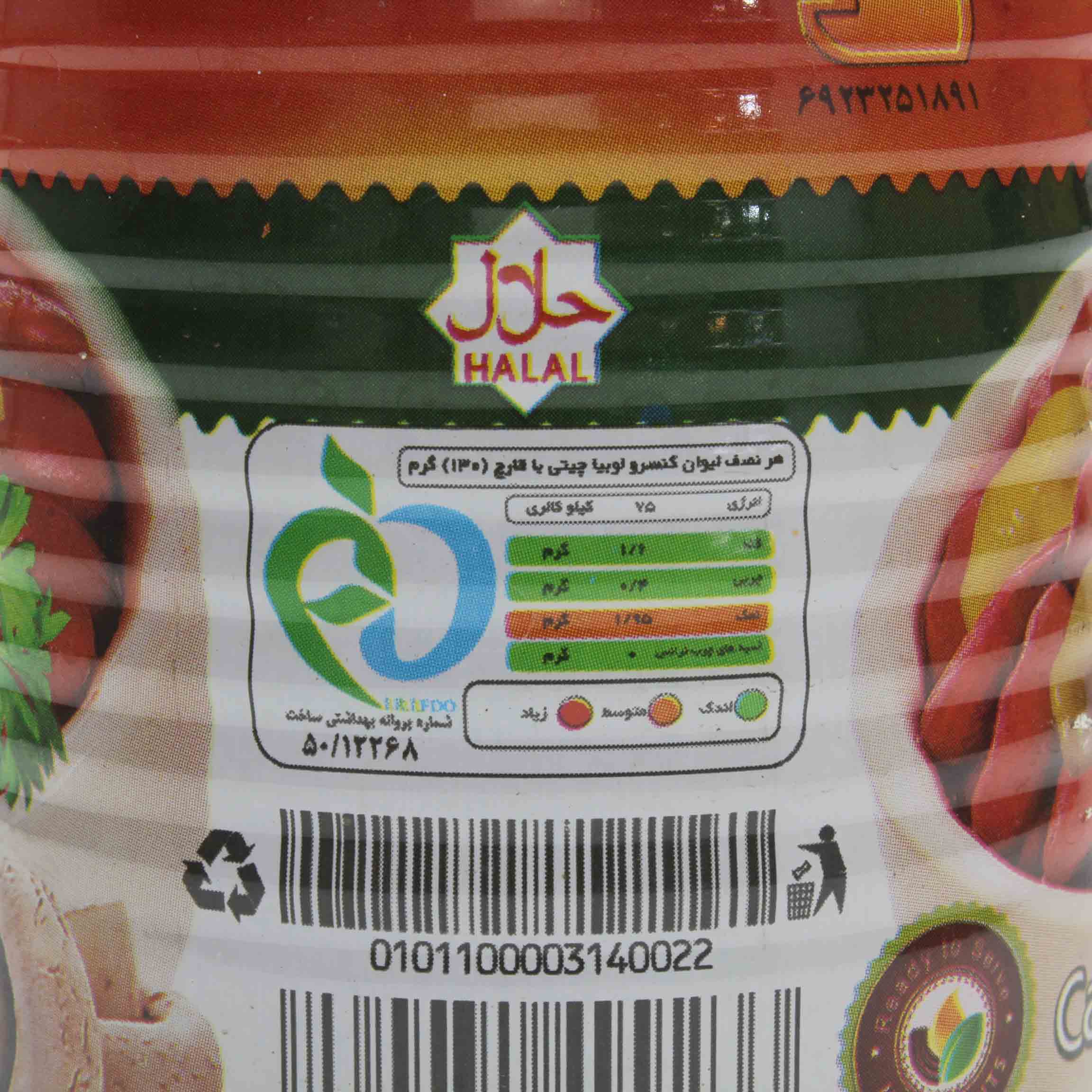 لوبیا چیتی ـ قارچ ـ رب گوجه فرنگی ـ نمک تصفیه شده خوراکی ـ پودر فلفل قرمز ـ آب آشامیدنی ـ درصد نمک:حداکثر5/1%.