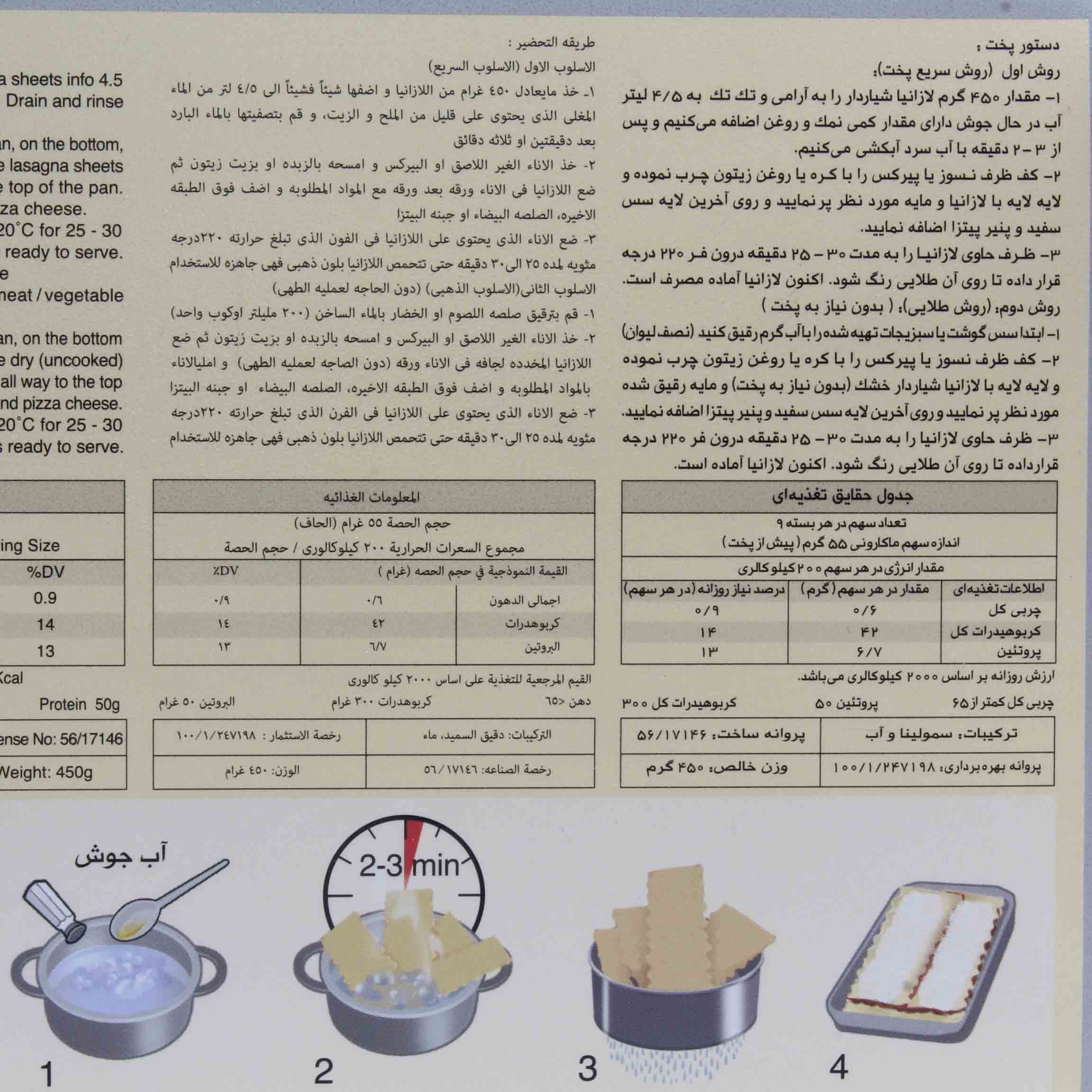 لازانیا شیاردار سریع پخت حاوی 2 ادویه مخصوص تک ماکارون 450 گرمی