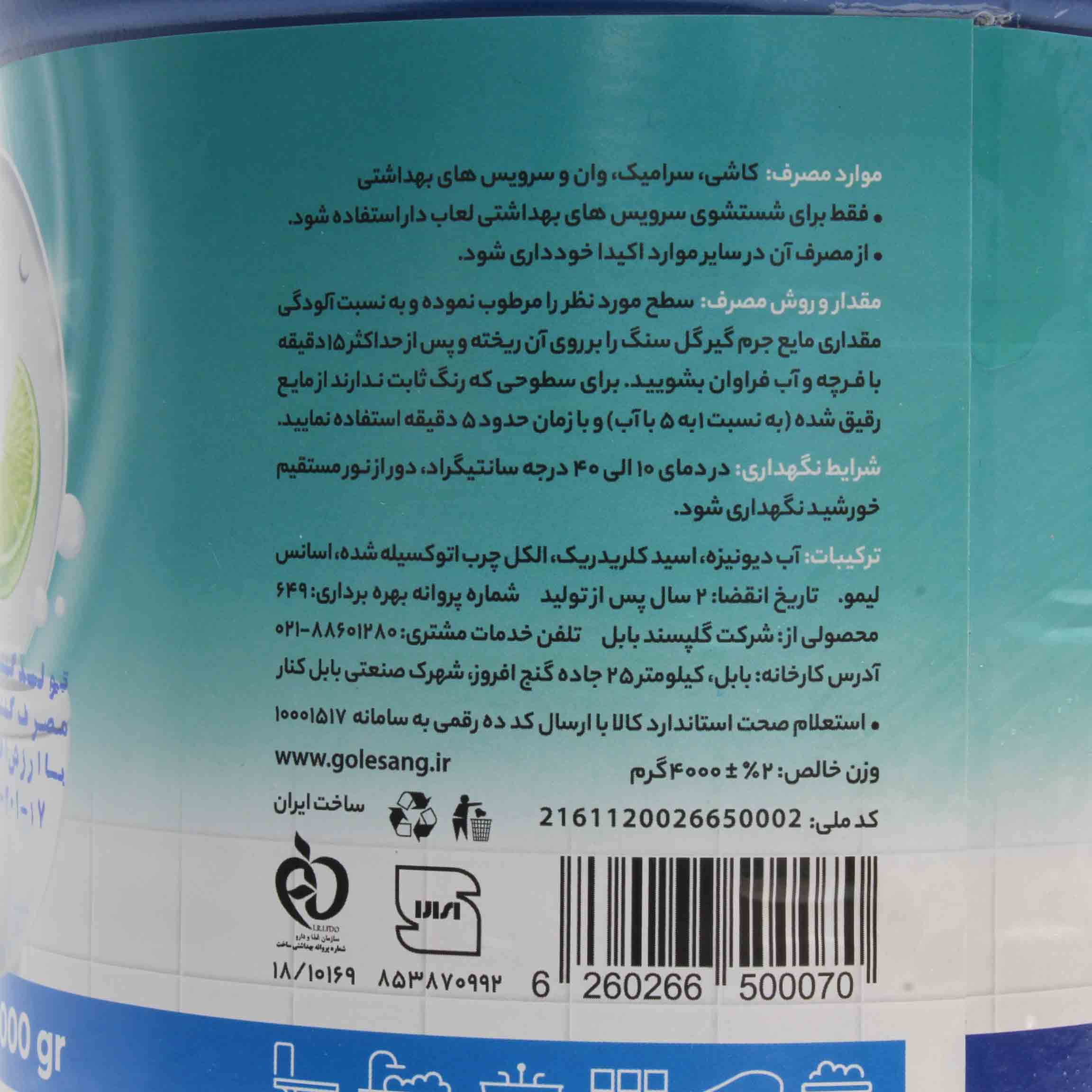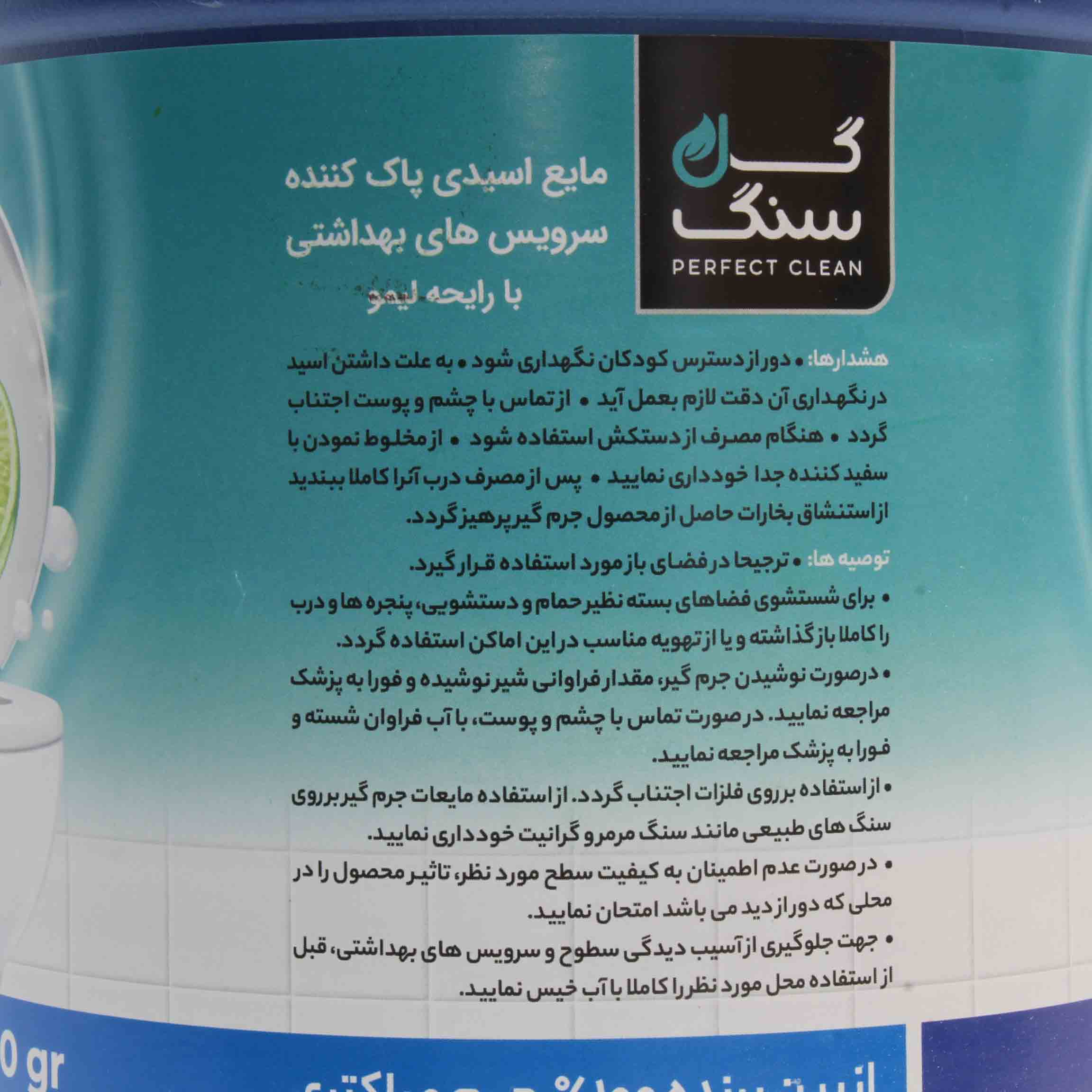 قبل از مصرف، خوب تکان دهید. سطح مورد نظر را مرطوب نموده و به نسبت آلودگی، مقداری مایع جرمگیر گل سنگ را بر روی آن ریخته و پس از حدّاکثر 15 دقیقه با فرچه و آب فراوان بشویید. برای سطوحی که رنگ ثابت ندارند، از مایع رقیق شده (به نسبت 1 به 5 با آب) و با زمان حدود 5 دقیقه استفاده نمایید.