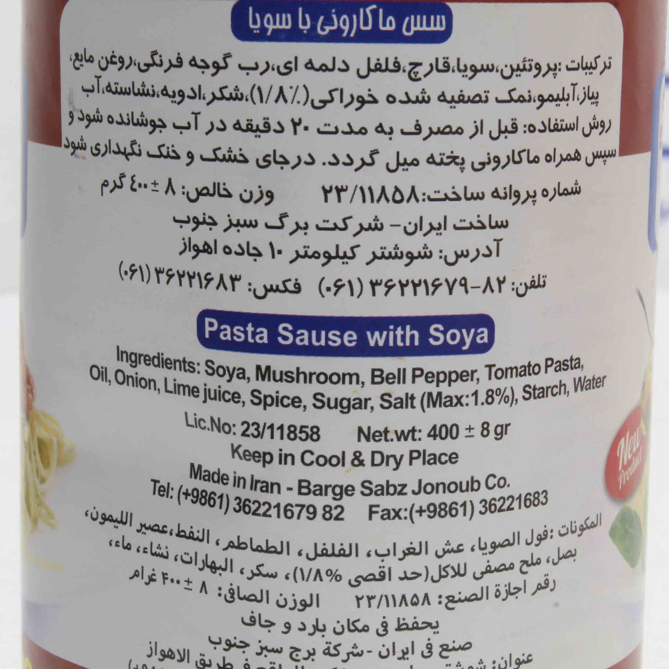 پروتئین سویا ـ قارچ ـ فلفل دلمهای ـ رب گوجه فرنگی ـ روغن مایع ـ پیاز ـ آب لیمو ـ نمک تصفیه شدۀ خوراکی 1.8% ـ شکر ـ ادویه ـ نشاسته ـ آب