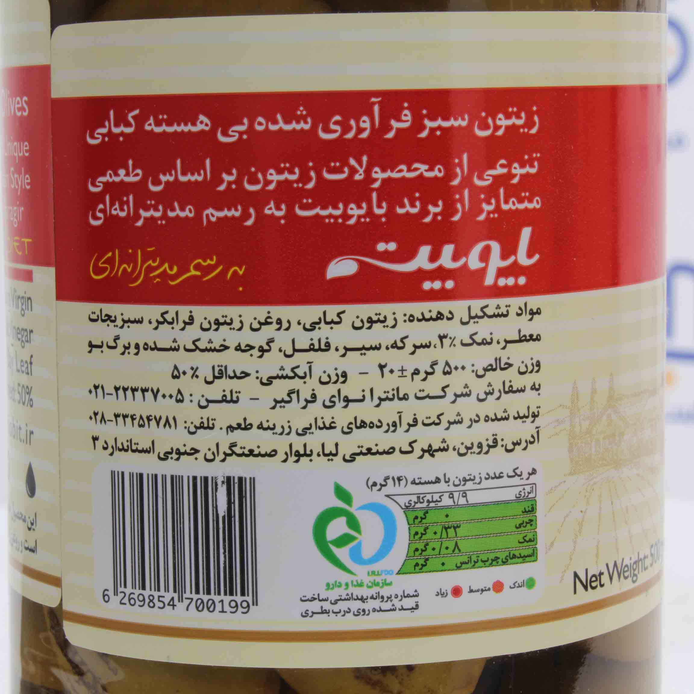 زیتون کبابی ، روغن زیتون فرابکر ، سبزیجات معطر ، نمک 3 % ، سرکه ، سیر ، فلفل ، گوجه خشک شده و برگ بو