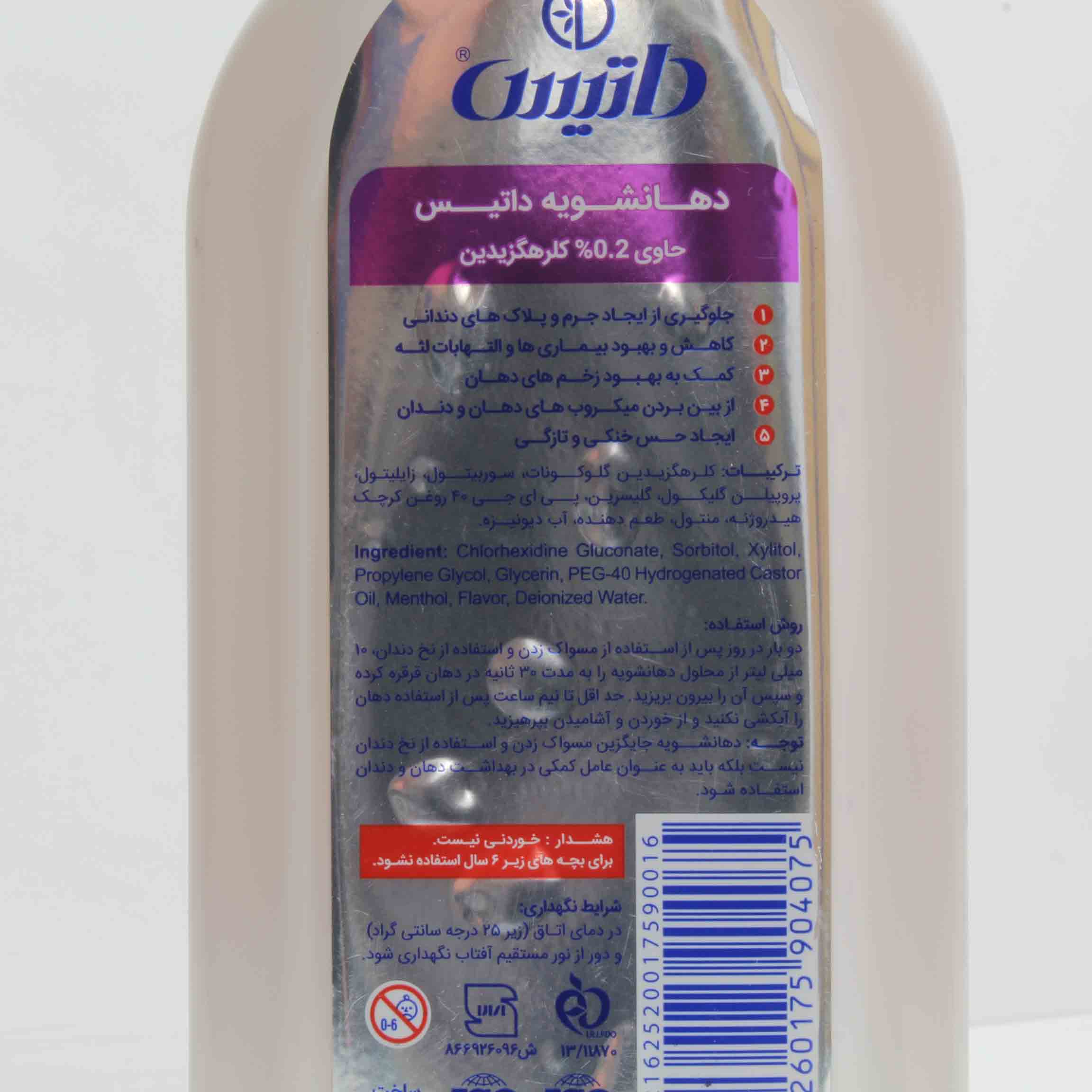 کلرهگزیدین گلوکونات ، سوربیتول ، زایلیتول ، پروپیلن گلیکول ، گلیسیرین ، پی ای جی 40 روغن کرچک هیدروژنه ، منتول ، طعم دهنده ، آب دیونیزه.