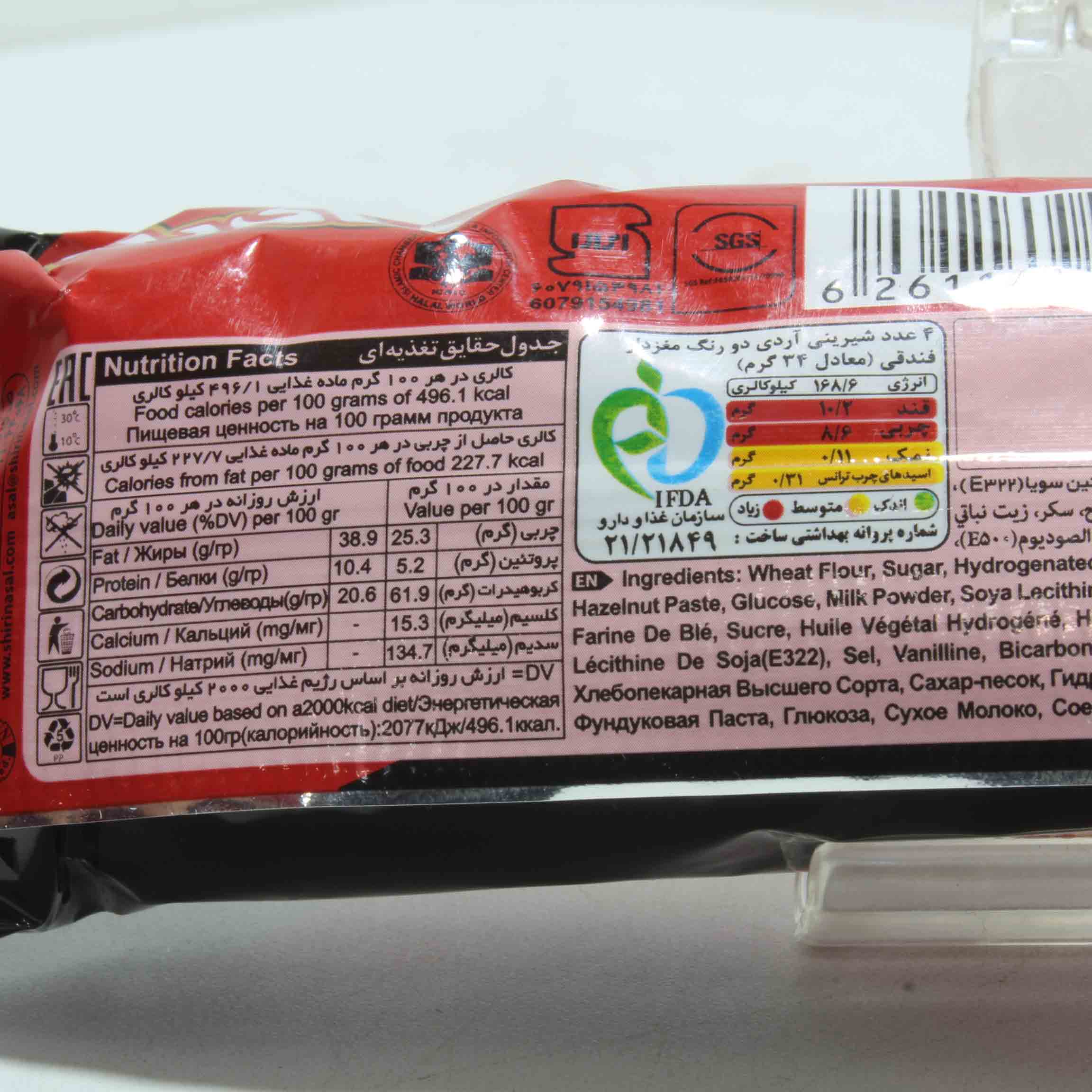 آرد گندم ، شکر ، روغن نباتی هیدروژنه ، روغن مایع ، پودر کاکائو ، نشاسته گندم ، تخم مرغ کامل ، خمیر فندق ، گلوکز ، شیر خشک ، لسیتین سویا ، نمک طعام ، طعم دهنده مشابه طبیعی وانیل ، بیکربنات سدیم ، اسید سدیم پیرو فسفات ، آب