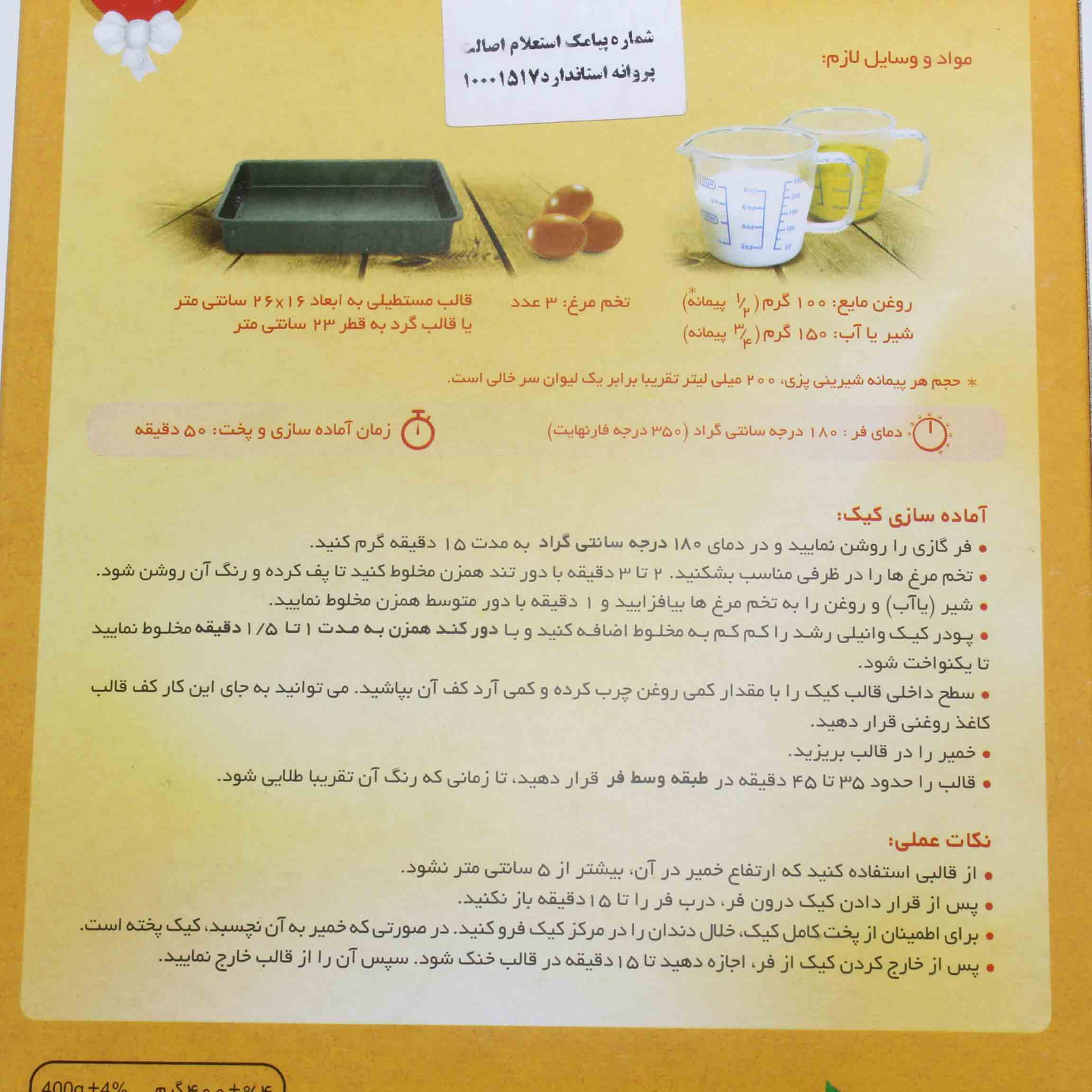 آرد گندم ، شکر، بیکینگ پودر ، امولسیفایر 471 E ، نمک تصفیه خوراکی ، وانیلین