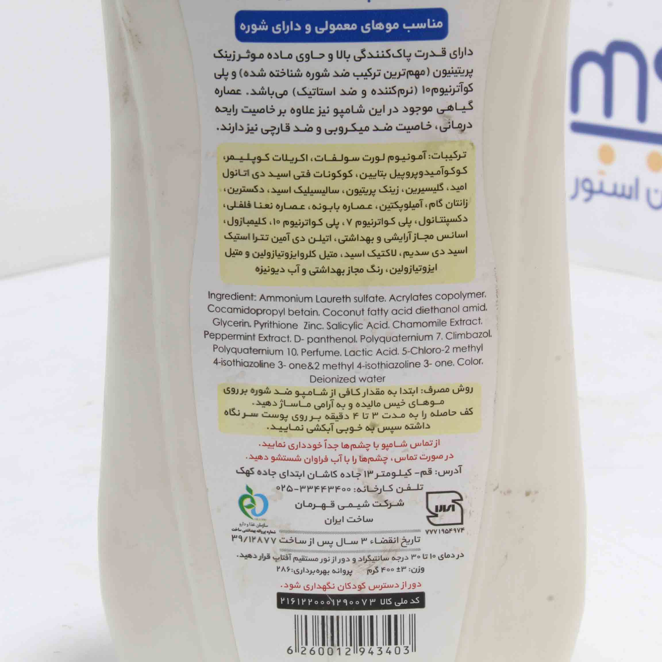 آمونیوم لورت سولفات ـ اکریلات کوپلیمر ـ کوکوآمیدوپروپیل بتائین ـ کوکونات فتی اسید دیاتانول امید ـ گلیسرین ـ زینک پریتیون ـ سالیسیلیک اسید ـ دکسترین ـ زانتان گام ـ آمیلوپکتین ـ عصارۀ بابونه ـ عصارۀ نعنا فلفلی ـ دکسپنتانول ـ پلی کواترنیوم 7 ـ پلی کواترنیوم 10 ـ کلیمبازول ـ اسانس مجاز آرایشی و بهداشتی ـ اتیلن دیآمین تترا استیک اسید دیسدیم ـ لاکتیک اسید ـ متیل ایزوتیازولین و متیل ایزوتیازولین ـ رنگ مجاز بهداشتی ـ آب دیونیزه
