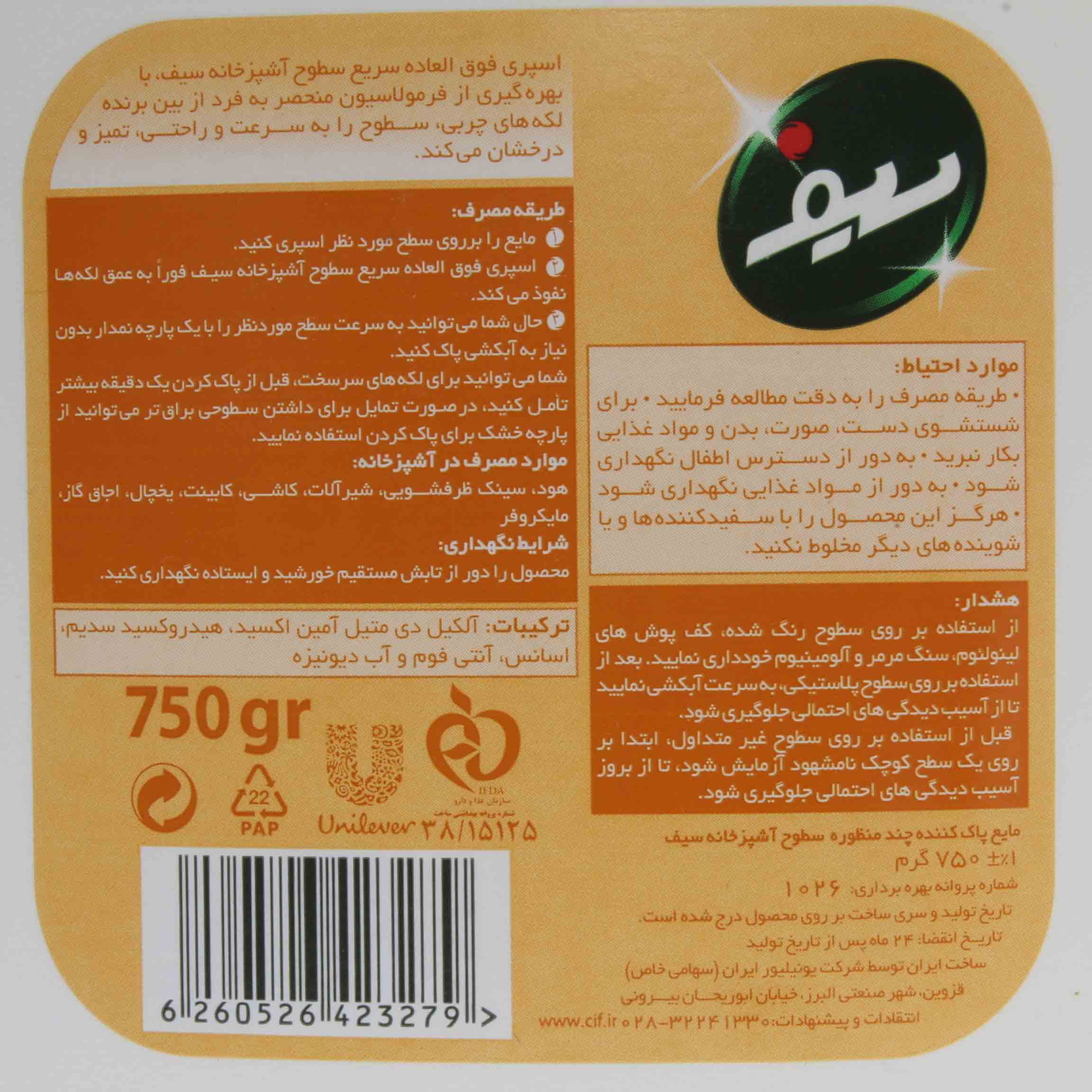 اسپری فوق العاده سریع سطوح آشپزخانۀ سیف با بهرهگیری از فرمولاسیون منحصر به فرد، از بین برندۀ لکّههای چربی، سطوح را به سرعت و راحتی، تمیز و درخشان میکند.