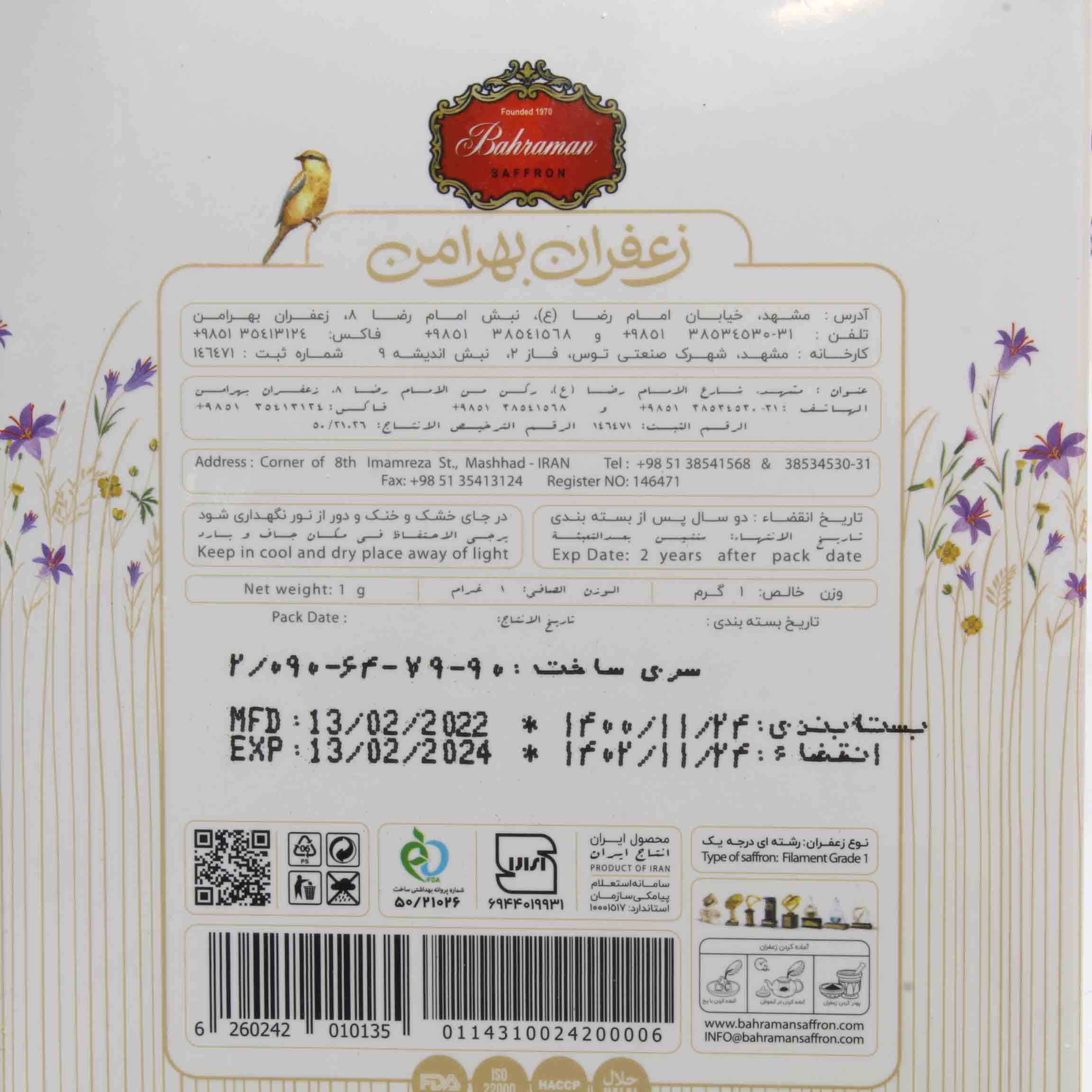 زعفران رشته ای درجه یک بهرامن 1 گرمی
