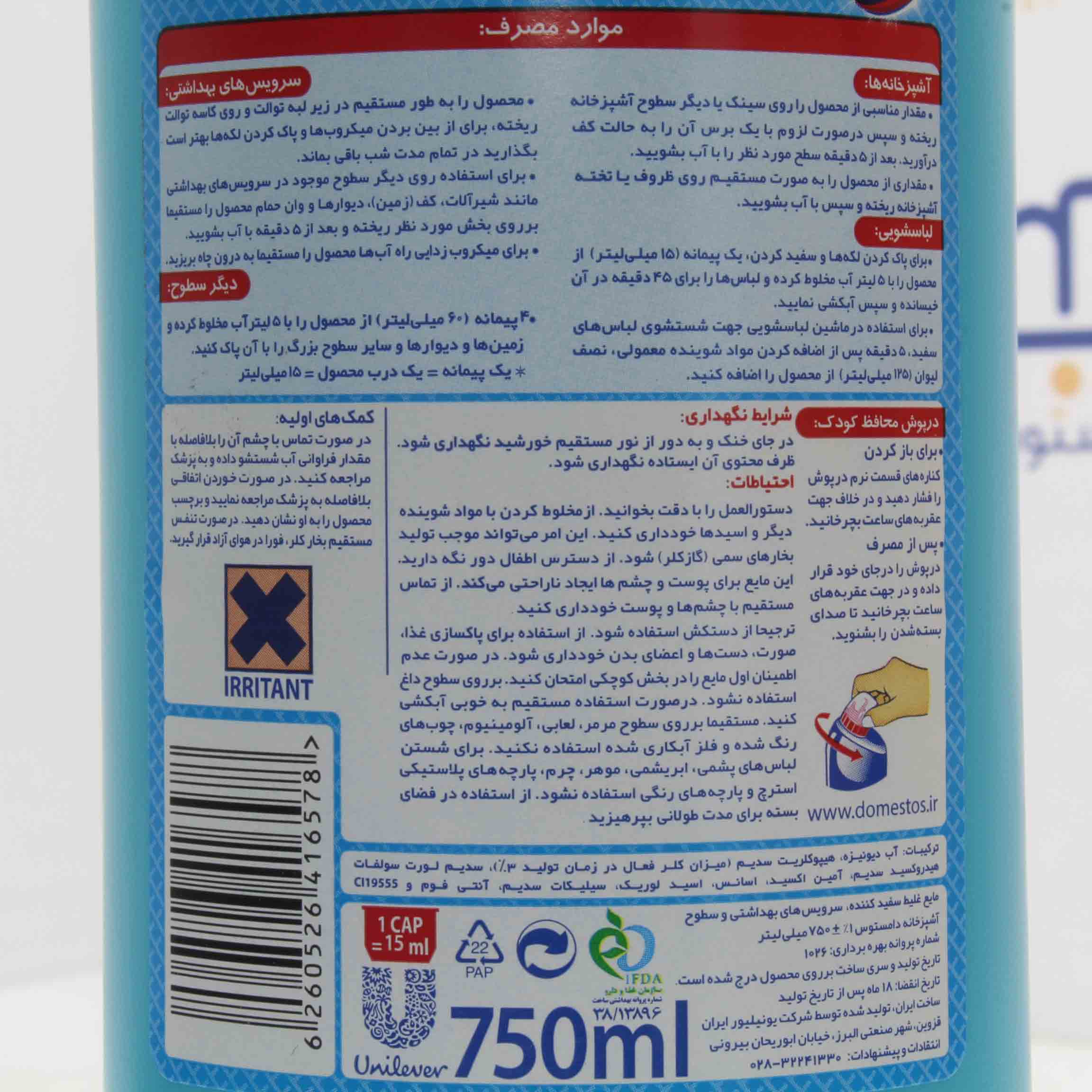 لباسشویی: برای پاک کردن لکّهها و سفید کردن، یک پیمانه (15 میلی لیتر) از محصول را با 5 لیتر آب مخلوط کرده و لباسها را برای 45 دقیقه در آن خیسانده و سپس آبکشی نمایید.